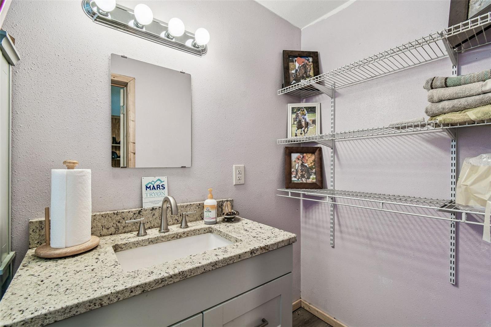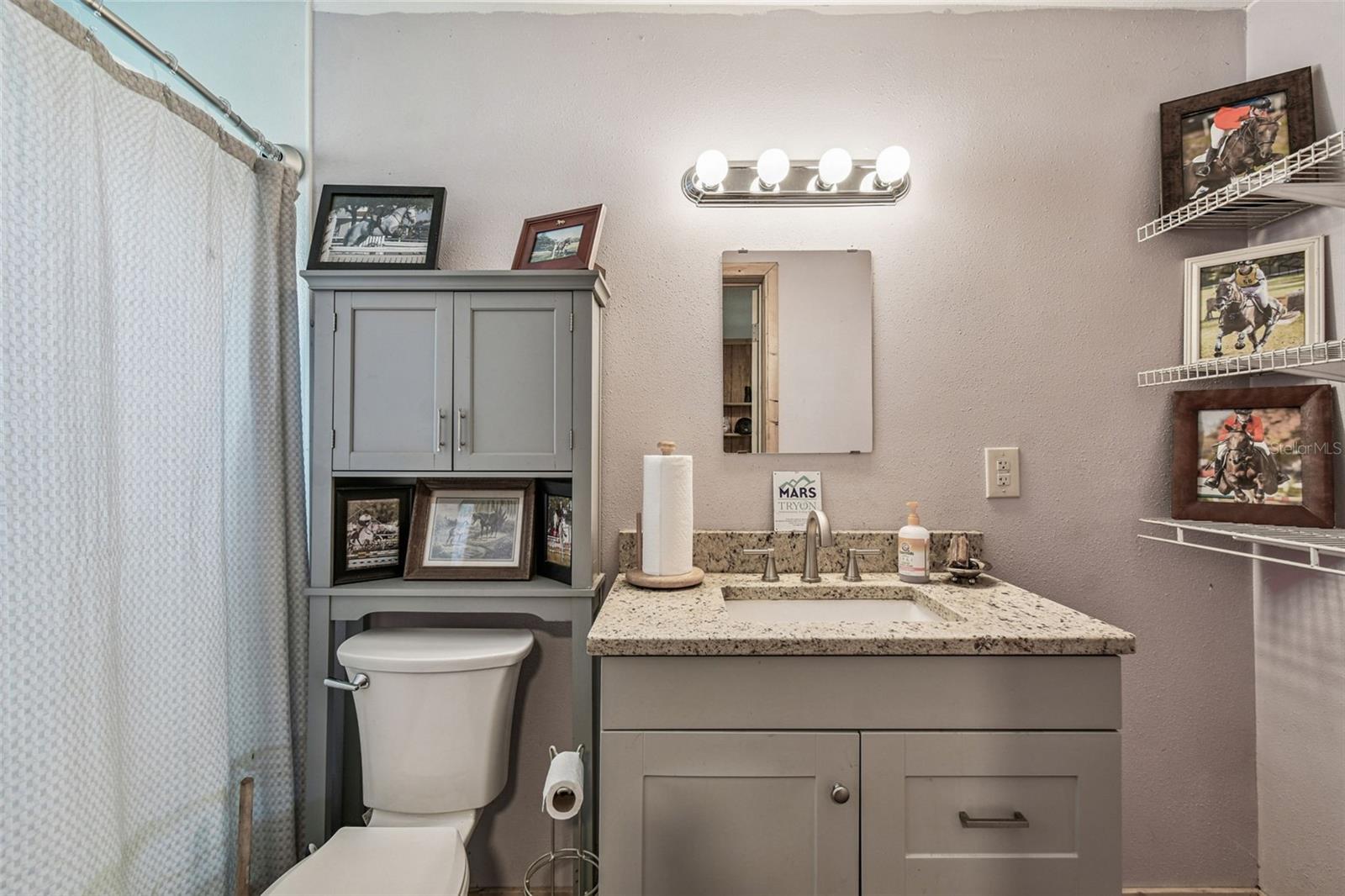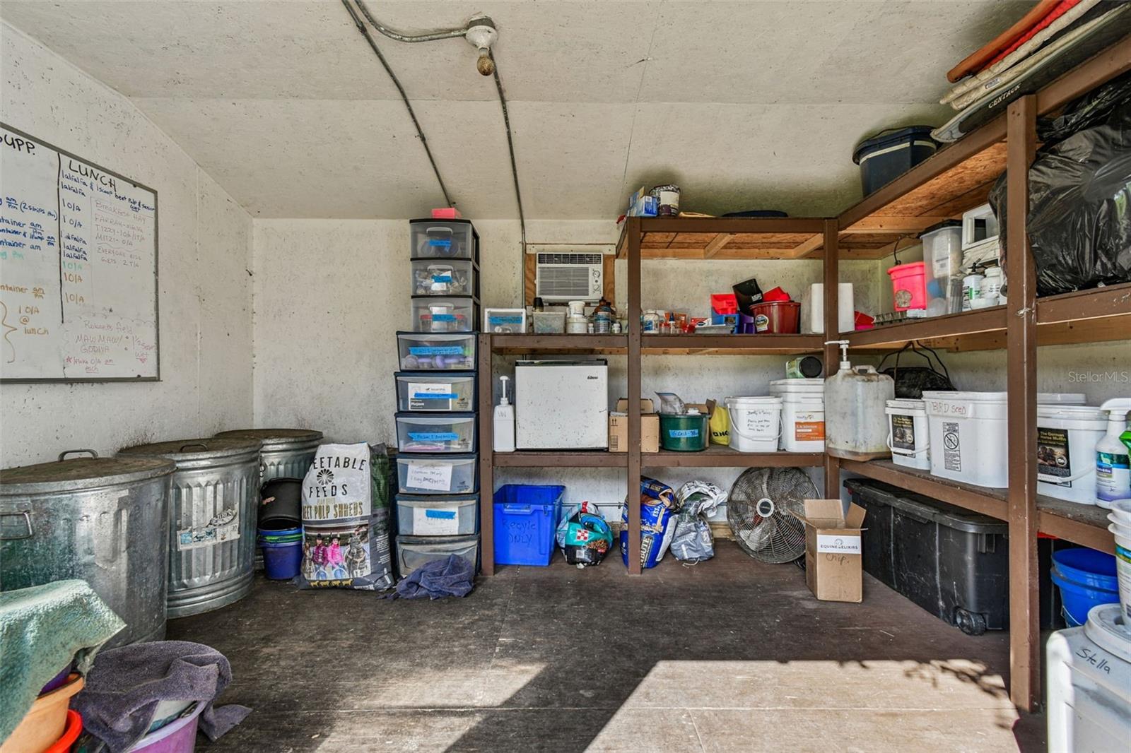 hooks, a fridge, microwave, eat-in area, and a full bathroom with a shower. There are 2 wash racks with hot water and a spacious 36x36 storage area with washer, dryer, and ample parking space for tractors and golf carts, with a golf cart included in the sale! Additional Features include Separate Feed & Hay Sheds each with raised floors, electric, and a mini fridge for storing medications. 4 additional detached stalls : Stall 1 (16x18) and Stall 2 (16x16) with fans and auto waterers. Stalls 3 & 4 (12x16 and 12x10) with runs and