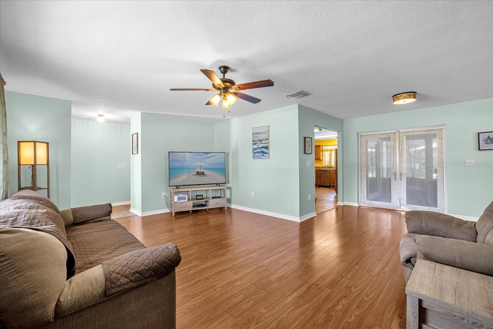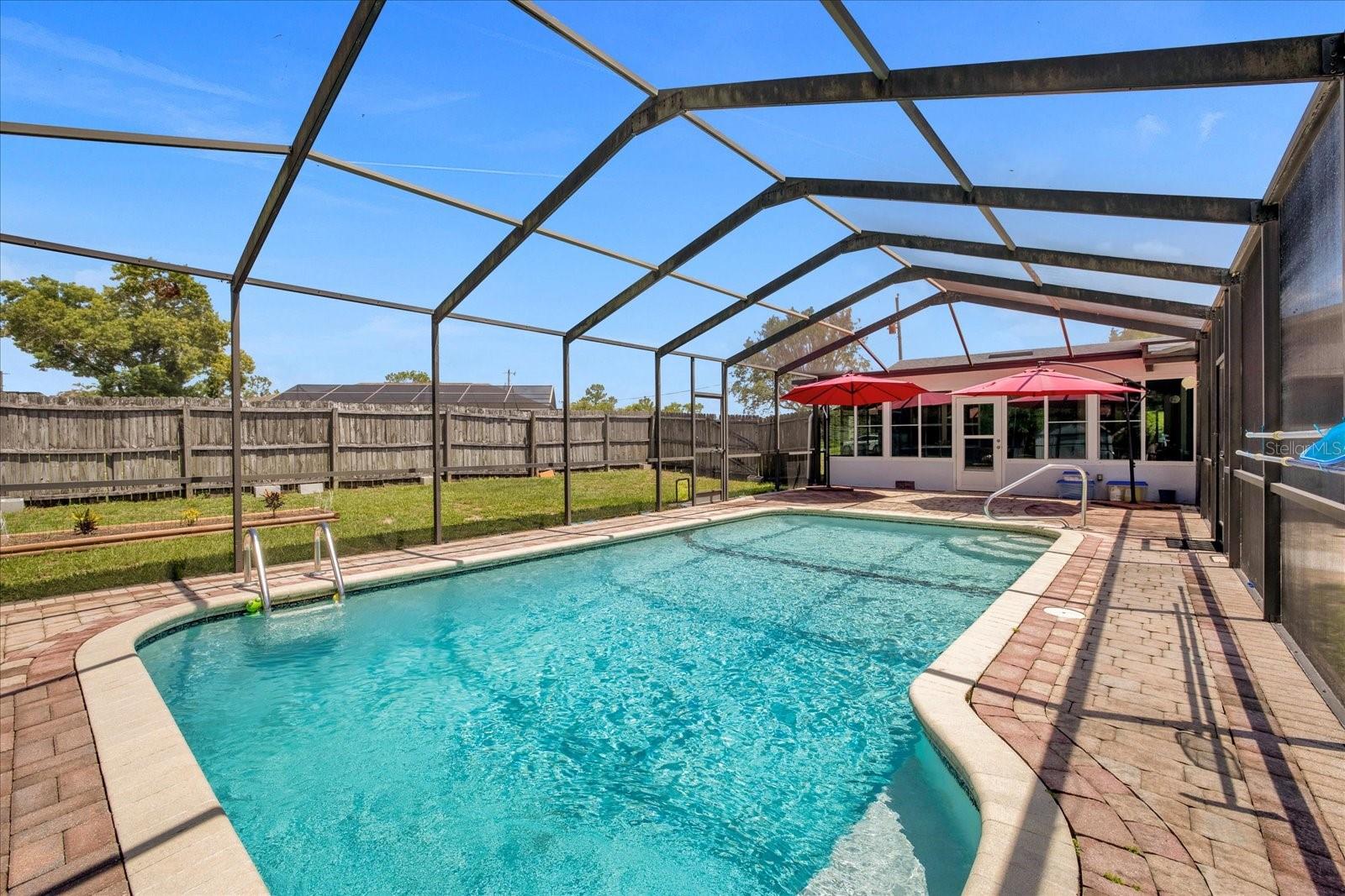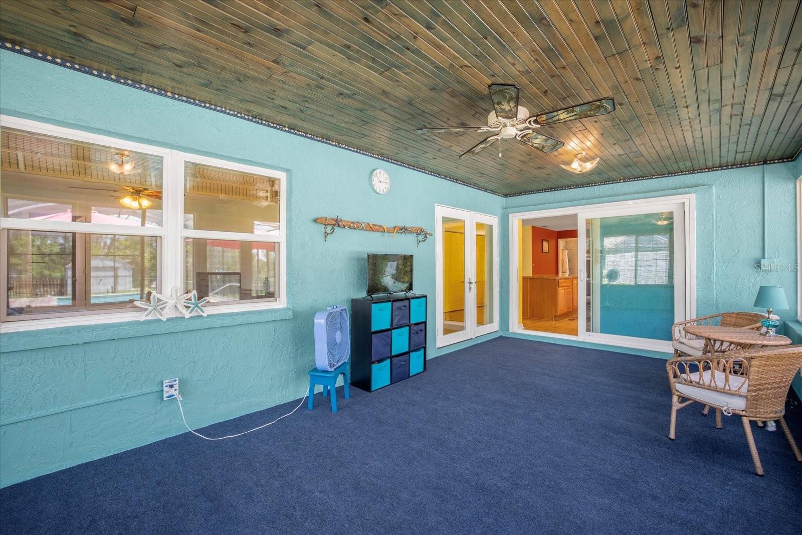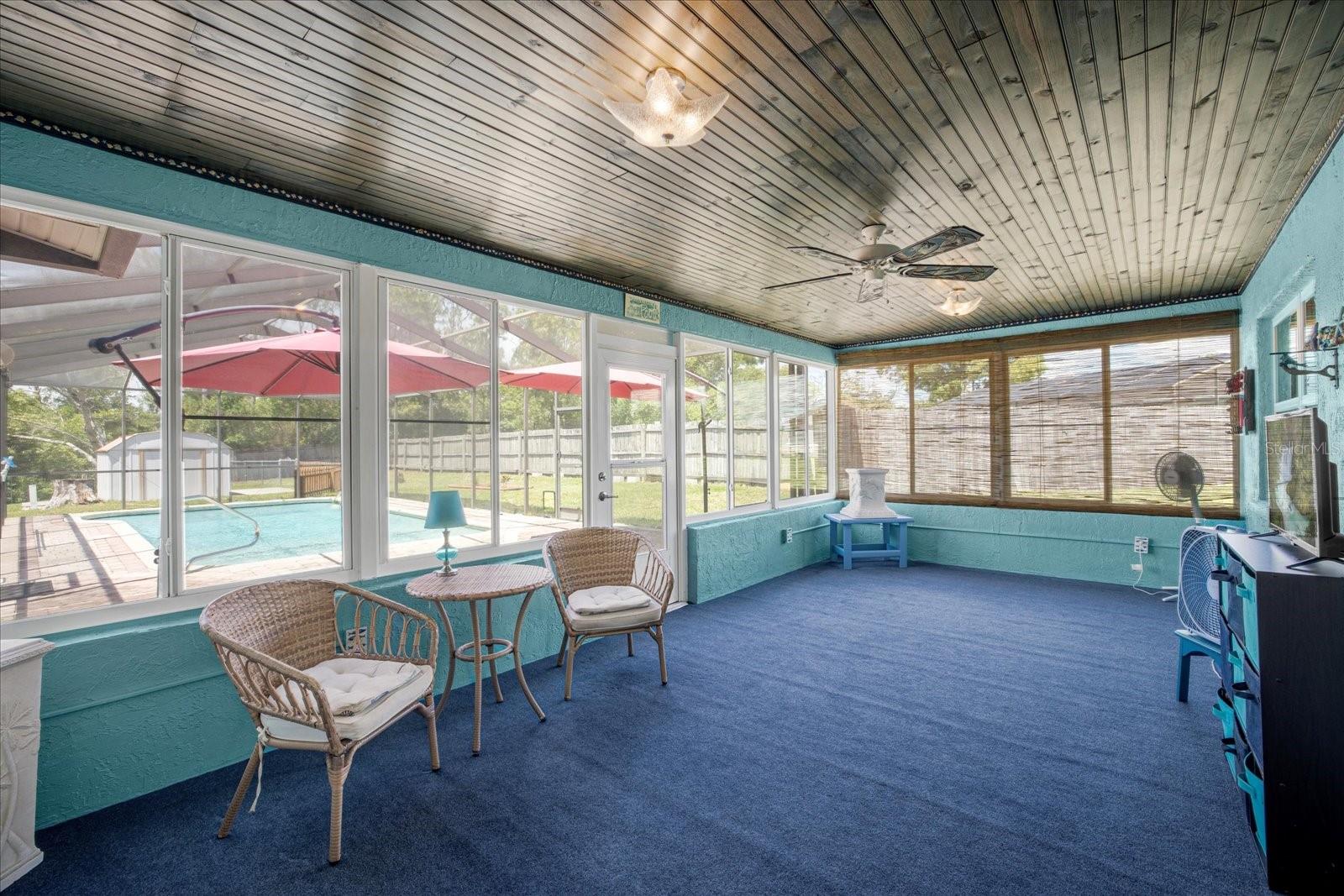 Did I mention the pool?? HUGE pool with lovely pavers surrounding this screened in beauty! A bench at the deep end for dipping your feet into the water after a long day. But the best part is the Florida room with its ADORABLE accents! The wood ceiling in this room makes you feel like you just stepped into Margaritaville! The custom ceiling fan, seashell decorations, even the outlet covers are cute with sea and beach decor! The Florida room is accessible from the kitchen through a super high quality vinyl sliding glass door or through the high end vinyl French doors that lead to the great room.