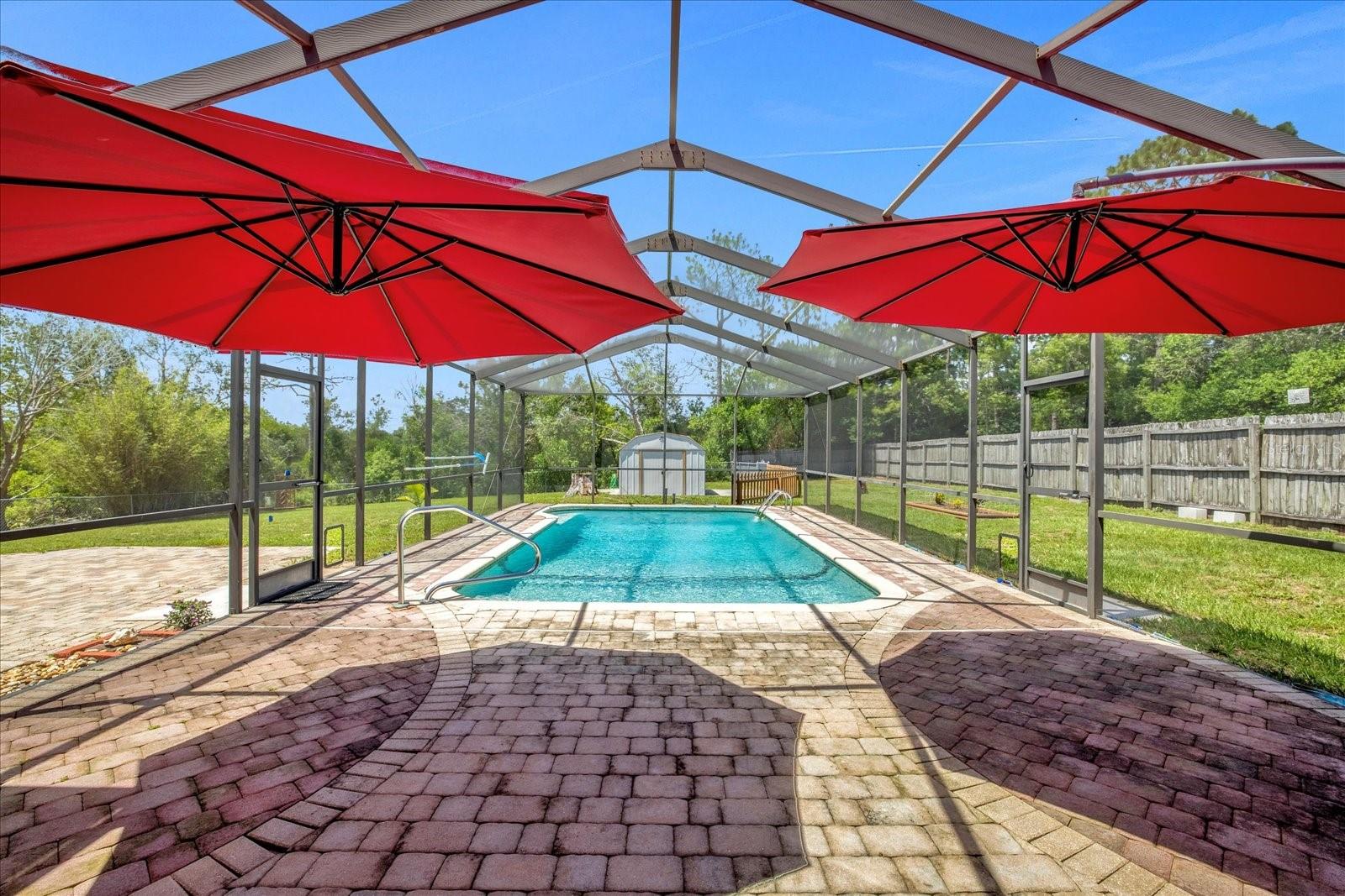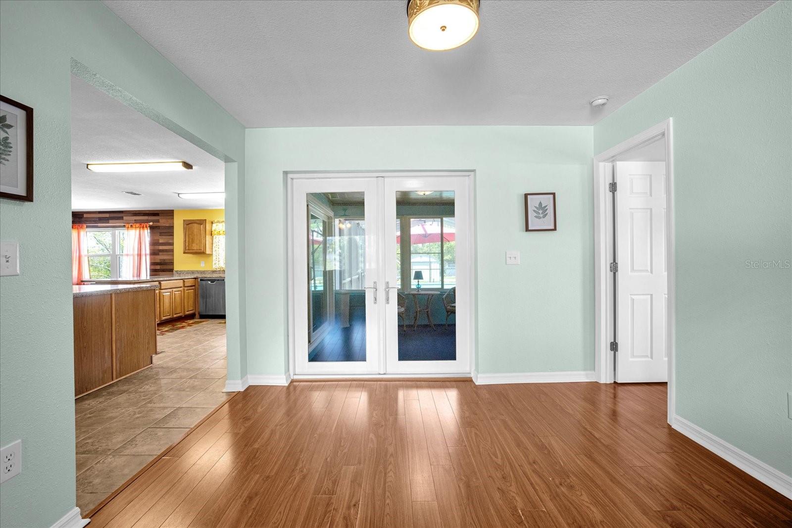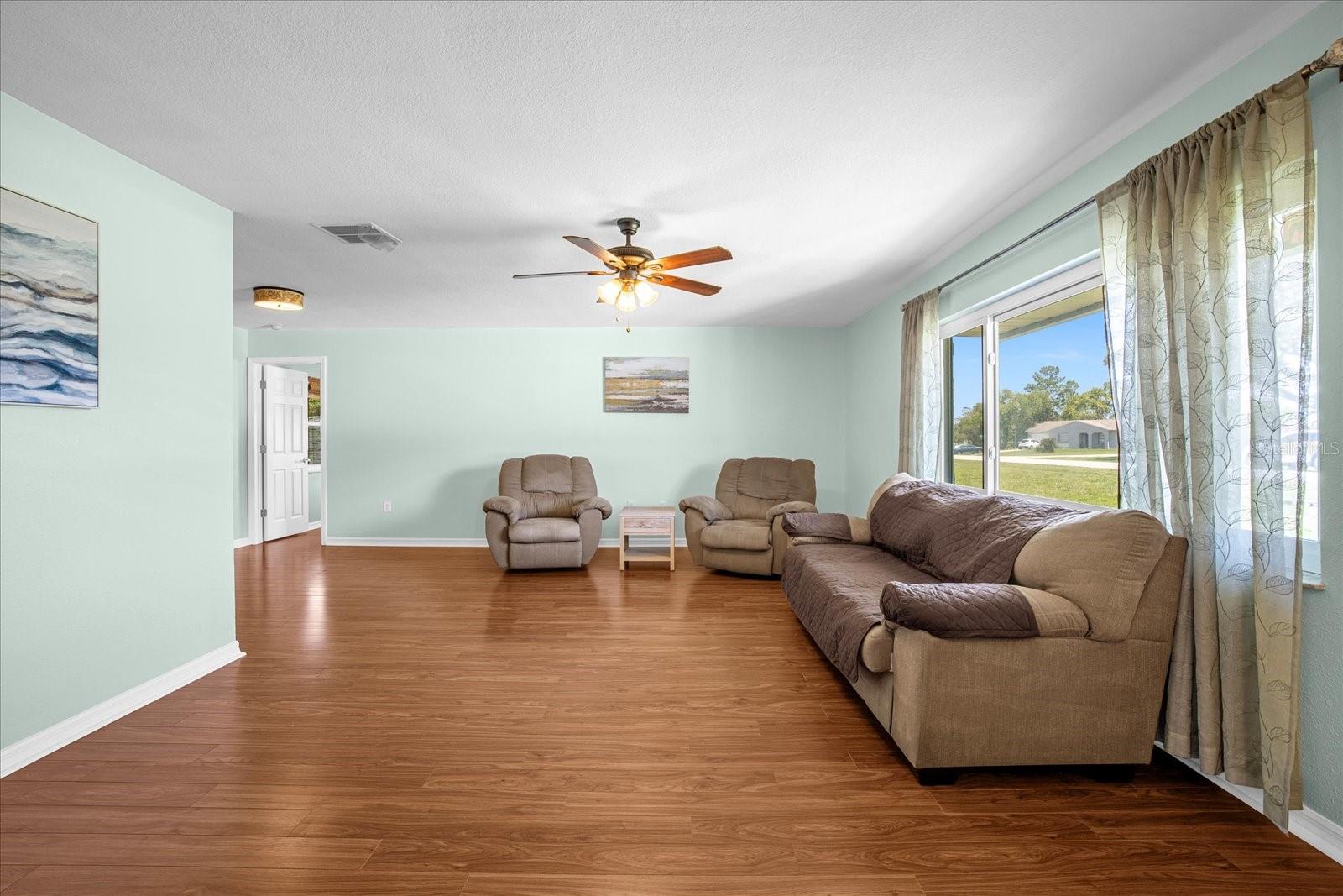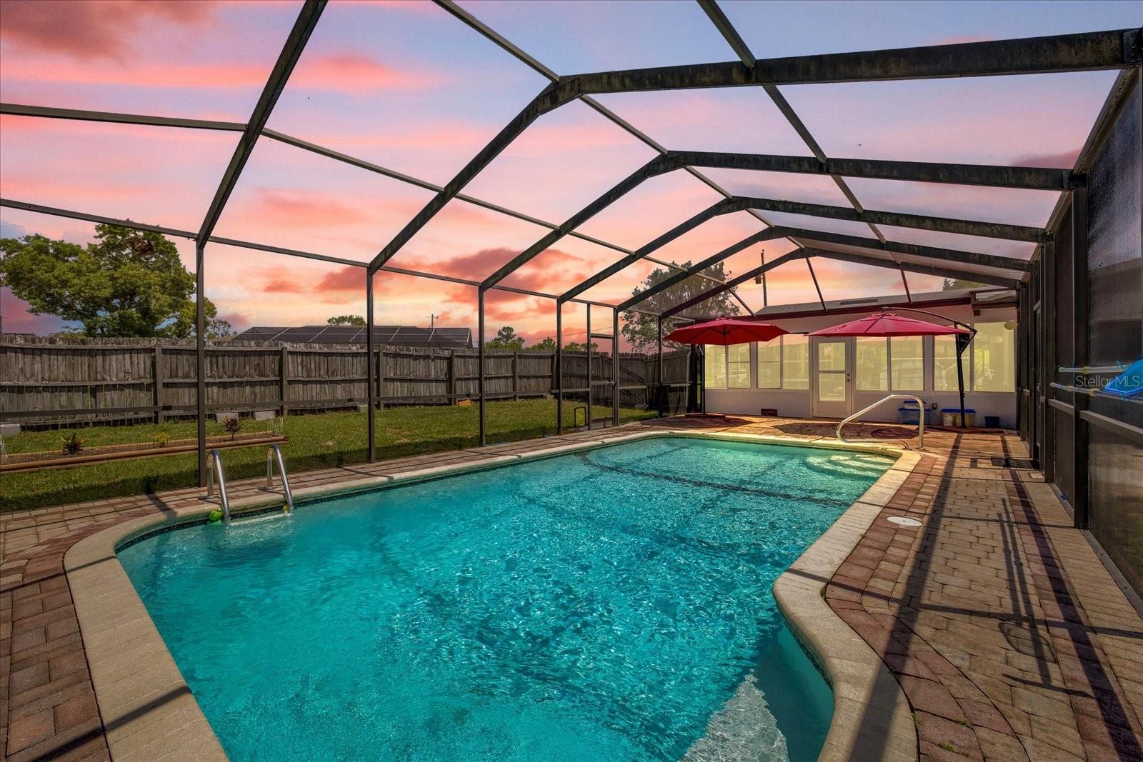 Did I mention the pool?? HUGE pool with lovely pavers surrounding this screened in beauty! A bench at the deep end for dipping your feet into the water after a long day. But the best part is the Florida room with its ADORABLE accents! The wood ceiling in this room makes you feel like you just stepped into Margaritaville! The custom ceiling fan, seashell decorations, even the outlet covers are cute with sea and beach decor! The Florida room is accessible from the kitchen through a super high quality vinyl sliding glass door or through the high end vinyl French doors that lead to the great room.