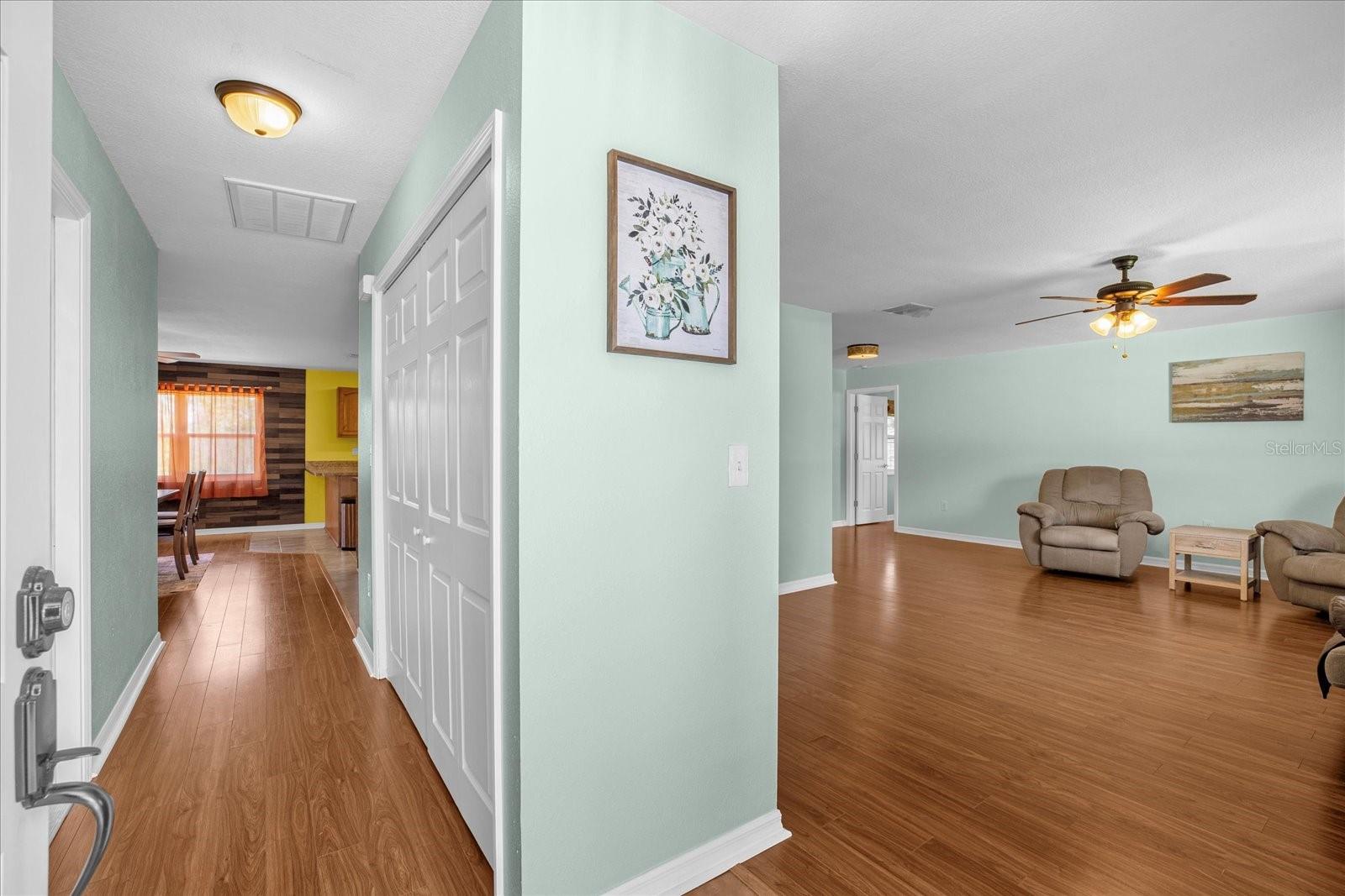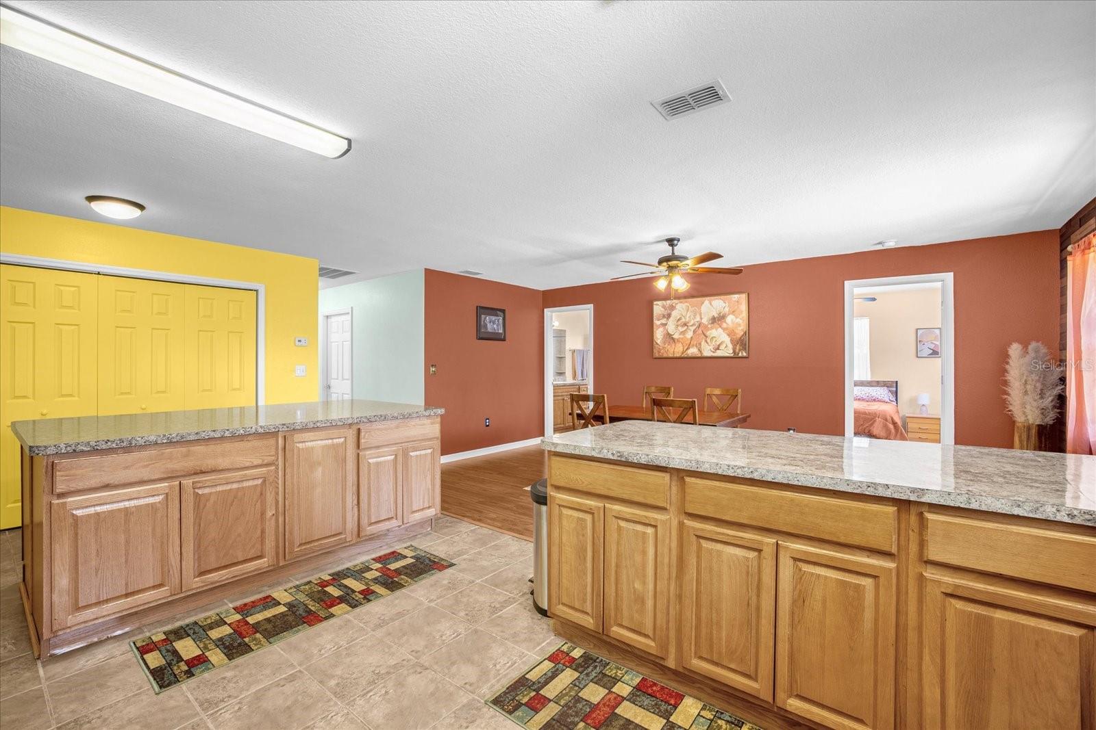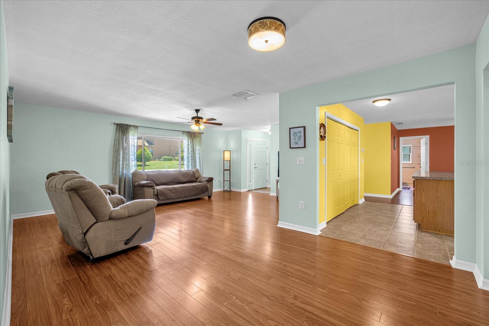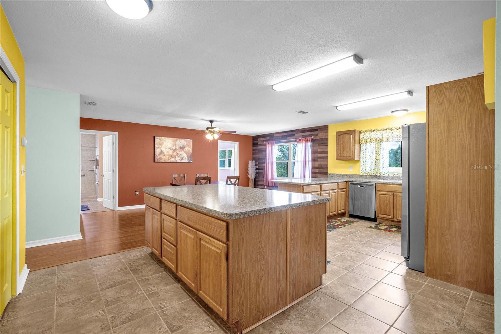 Did I mention the pool?? HUGE pool with lovely pavers surrounding this screened in beauty! A bench at the deep end for dipping your feet into the water after a long day. But the best part is the Florida room with its ADORABLE accents! The wood ceiling in this room makes you feel like you just stepped into Margaritaville! The custom ceiling fan, seashell decorations, even the outlet covers are cute with sea and beach decor! The Florida room is accessible from the kitchen through a super high quality vinyl sliding glass door or through the high end vinyl French doors that lead to the great room.