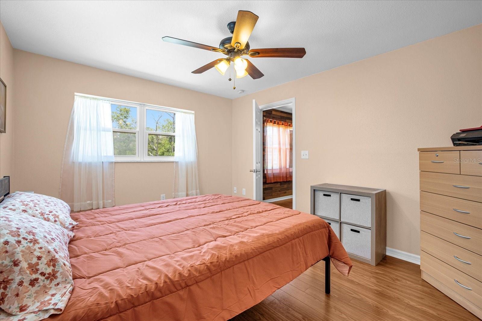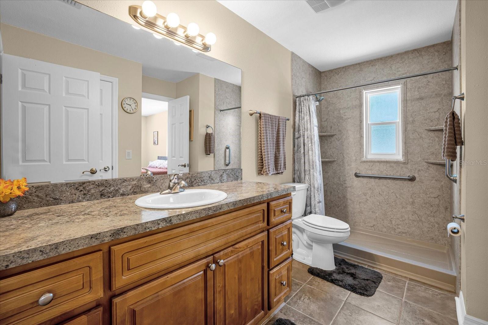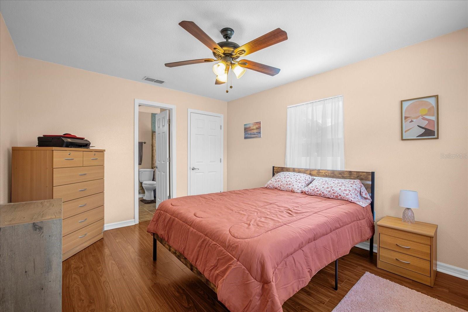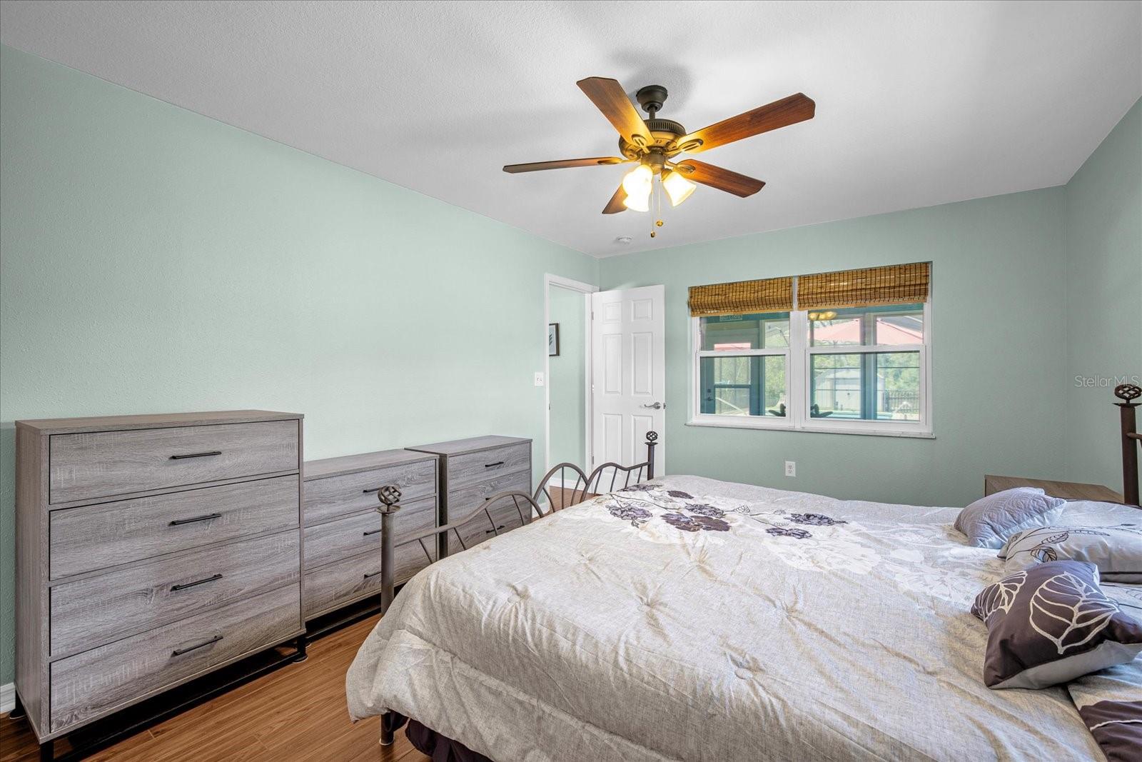 The 2nd bedroom is en suite, with attached bathroom that is also accessible from the hall. Also bright and airy with views of the pool and back yard.