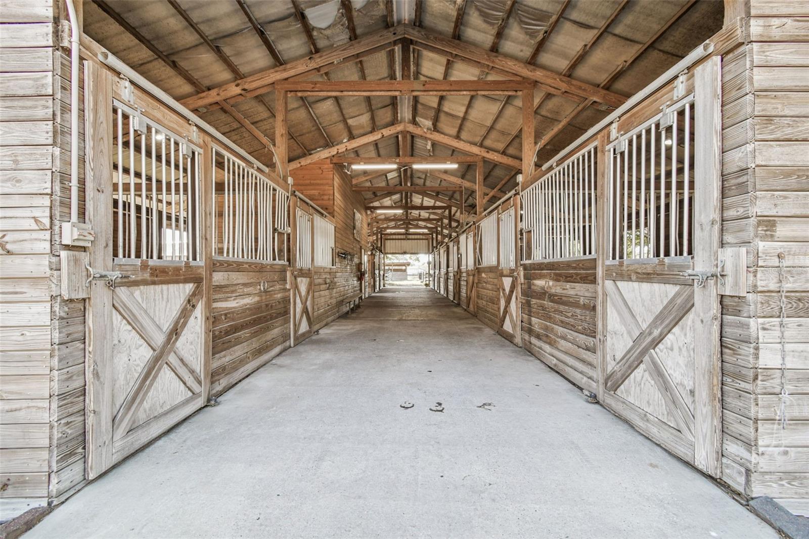 The main barn is an insulated center aisle barn situated east to west to take advantage of the sea breeze. With plenty of mature oaks there is always a breeze and shade even on the hottest summer days. With a center aisle barn with 11 stalls plus 2 more in a paddock this farm can easily accommodate more than a dozen horses. All stalls have their own water shut off valve for water buckets, electric for fans, and mats with clay underneath. The main barn houses a very large tack room, a wash rack with hot water, extra grooming racks, and an open porch with a hanging swing and chairs for the riders. There are also two outside wash racks shaded by oak trees.