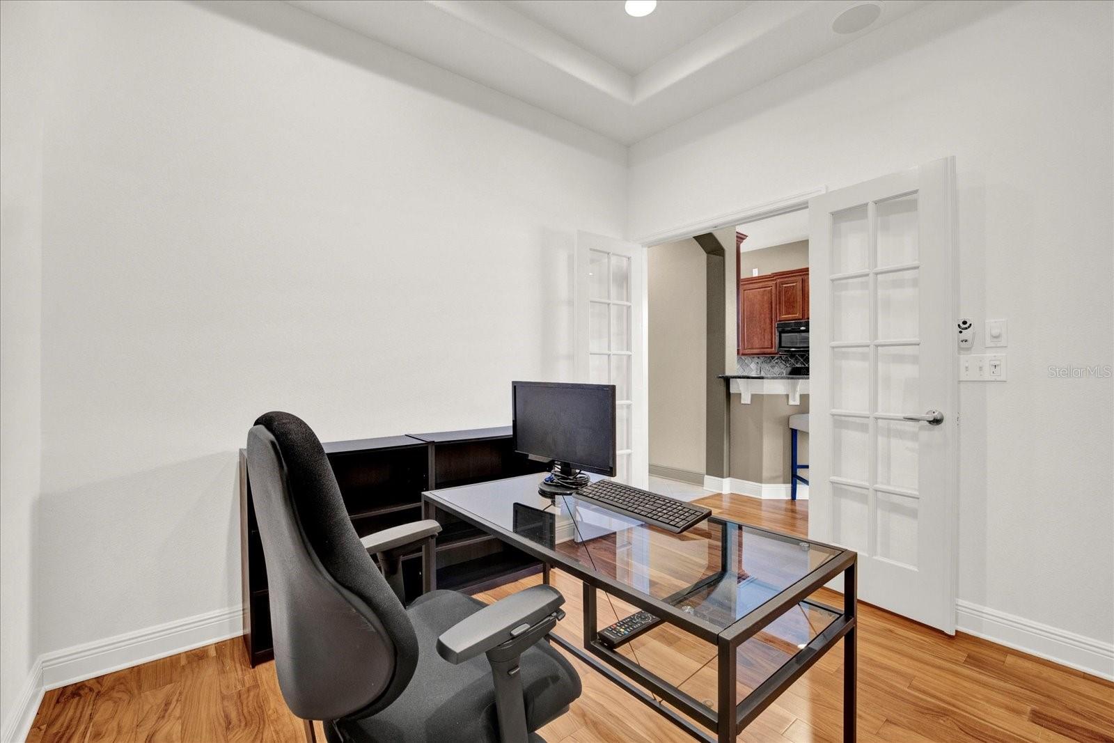 The den/office has a tray ceiling and comes with french doors so you can close the wrold away for work or turn it into a 3rd bedroom for guests.
