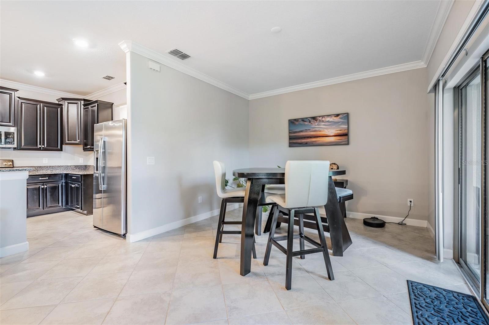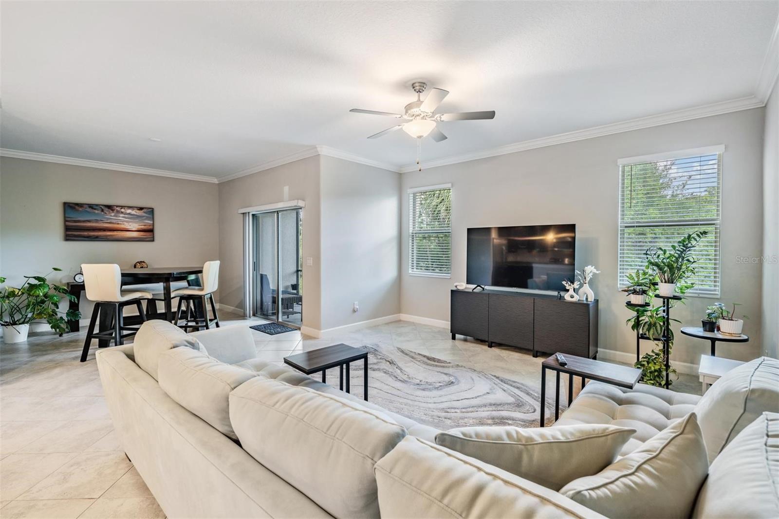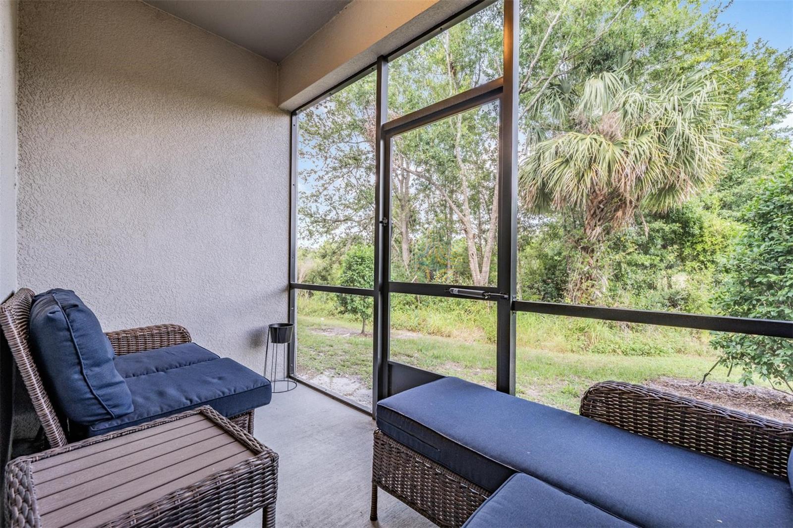 The expansive living area flows seamlessly to a private, screened-in patio overlooking a serene conservation lot, providing a tranquil backdrop for relaxation and outdoor enjoyment. This unique setting ensures privacy and a connection to nature right at your doorstep.