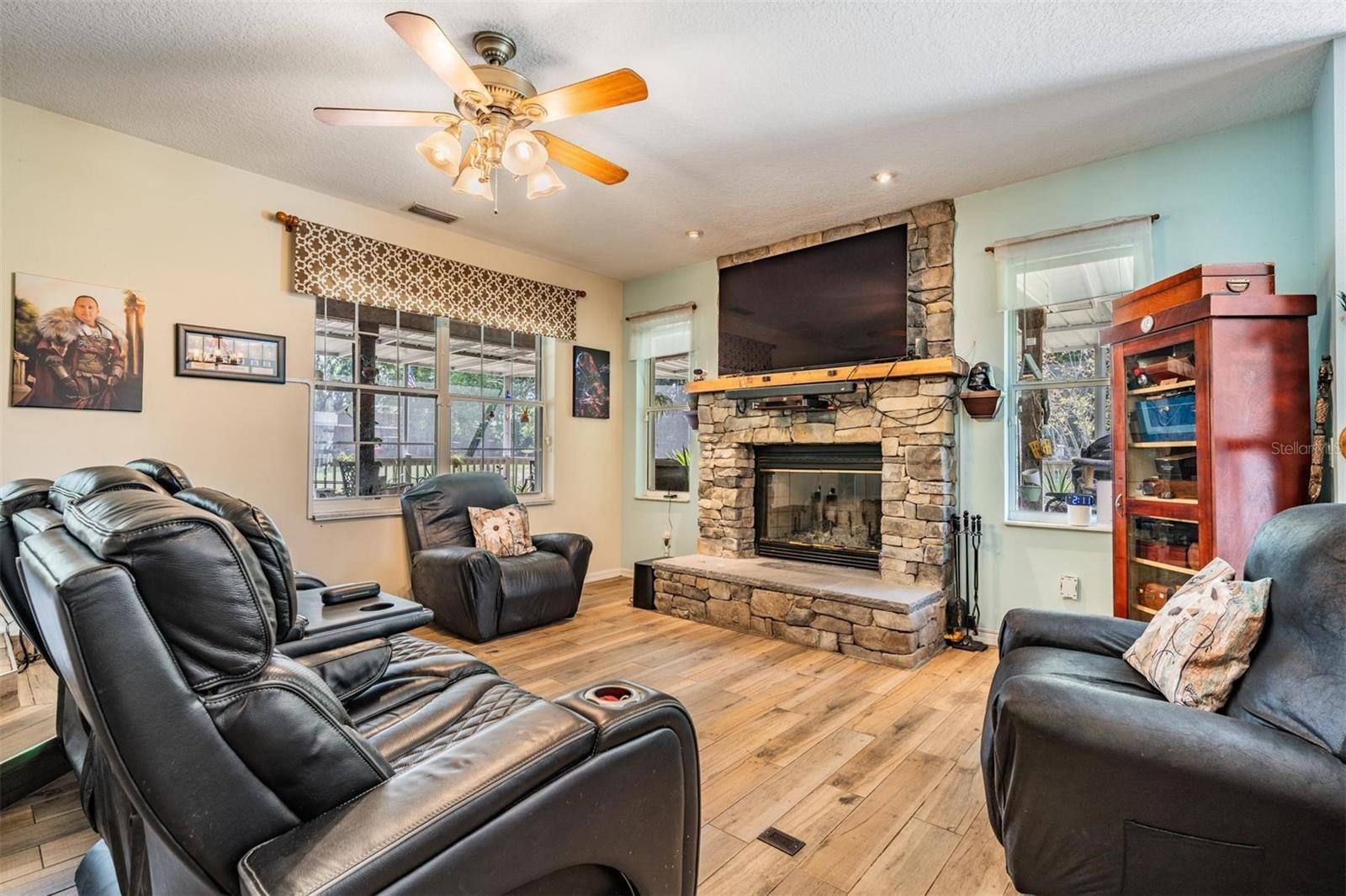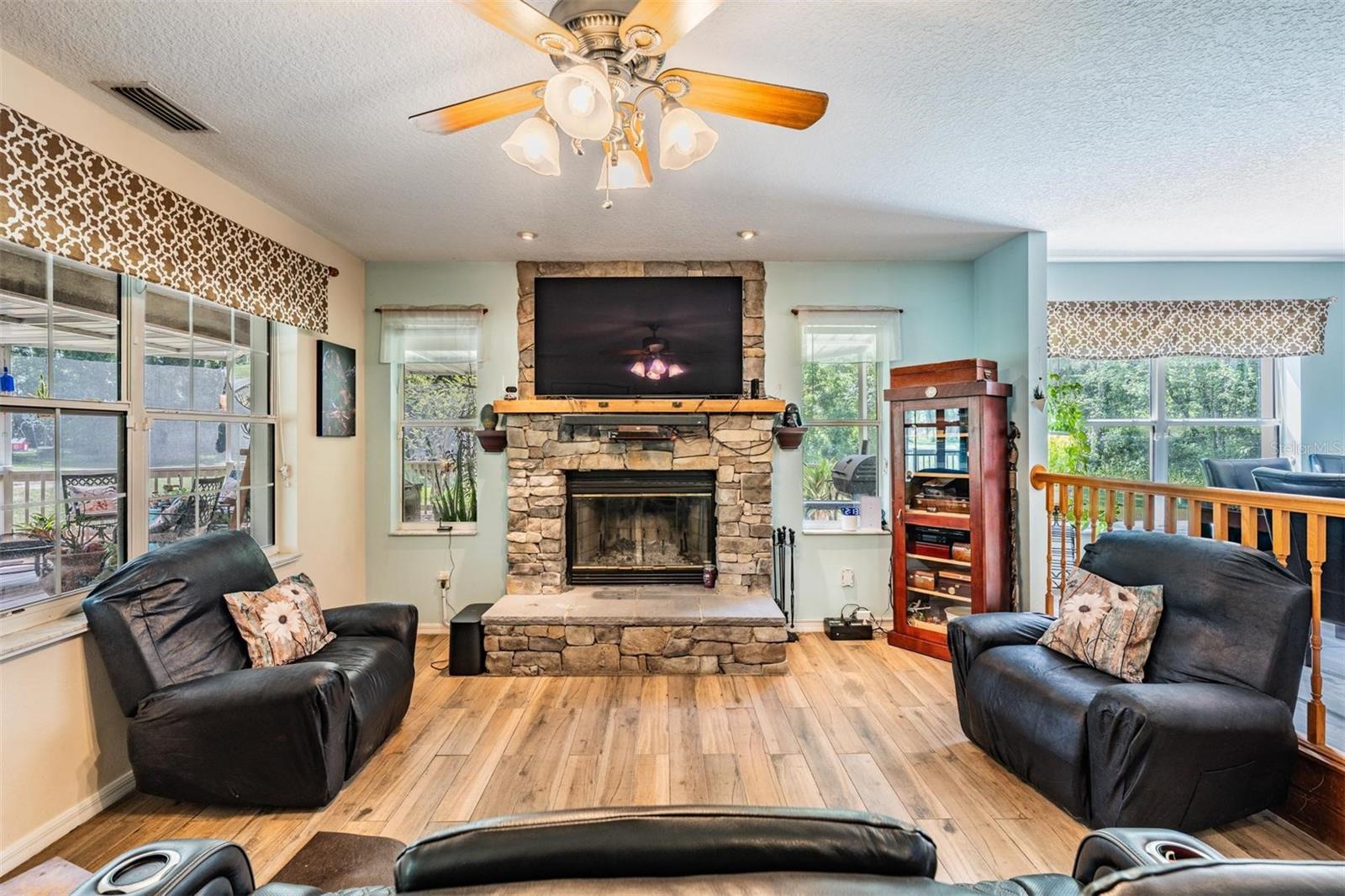 The home is 3 bedrooms, 2 baths with the primary upstairs with huge windows allowing you to take in the beauty of the property. Porcelain tile throughout, updated bathrooms, tons of storage, a wood burning fireplace, and a wrap around covered and screened in porch.