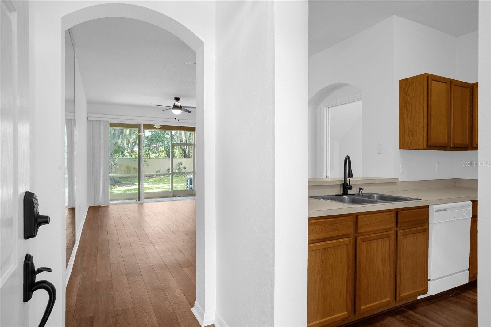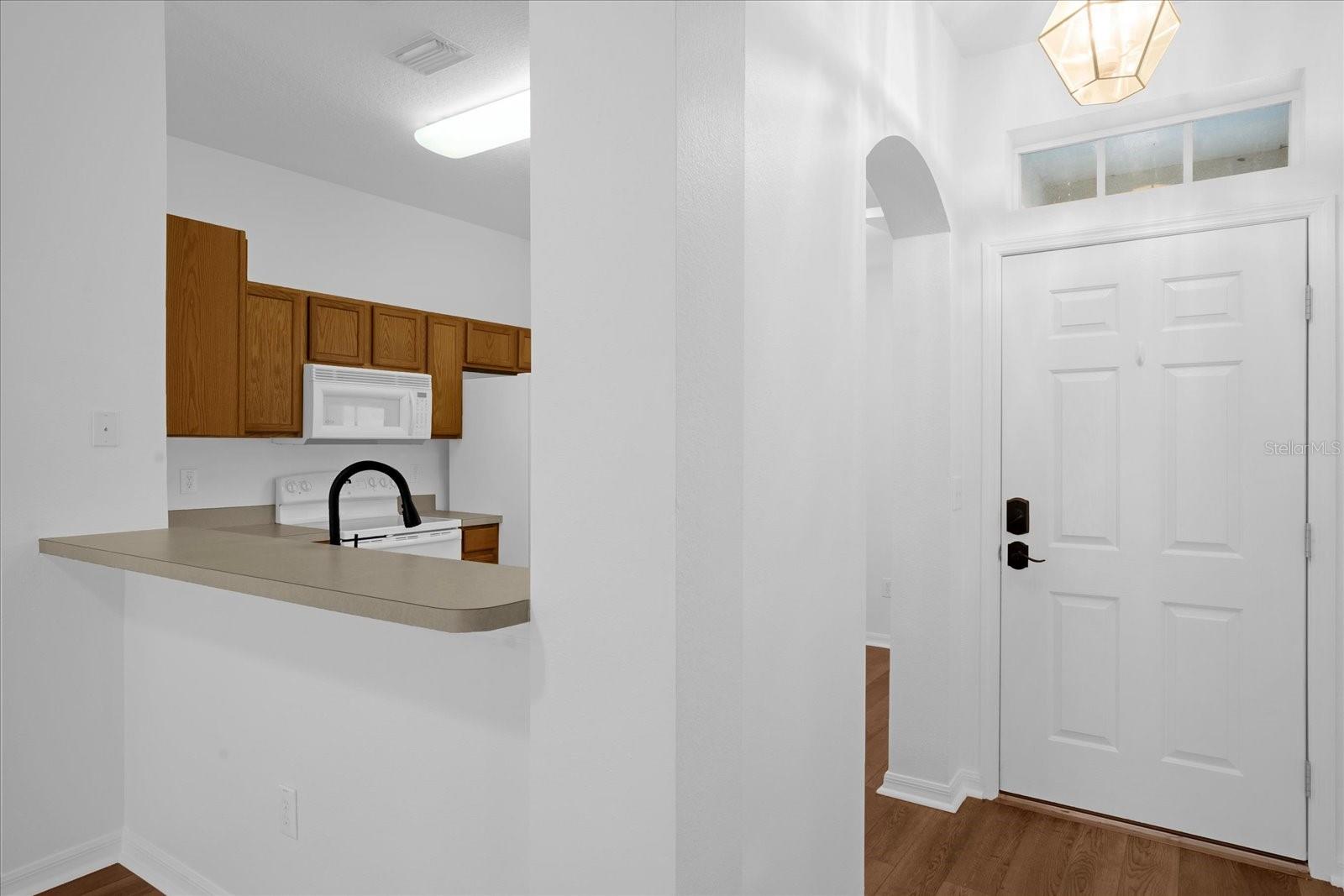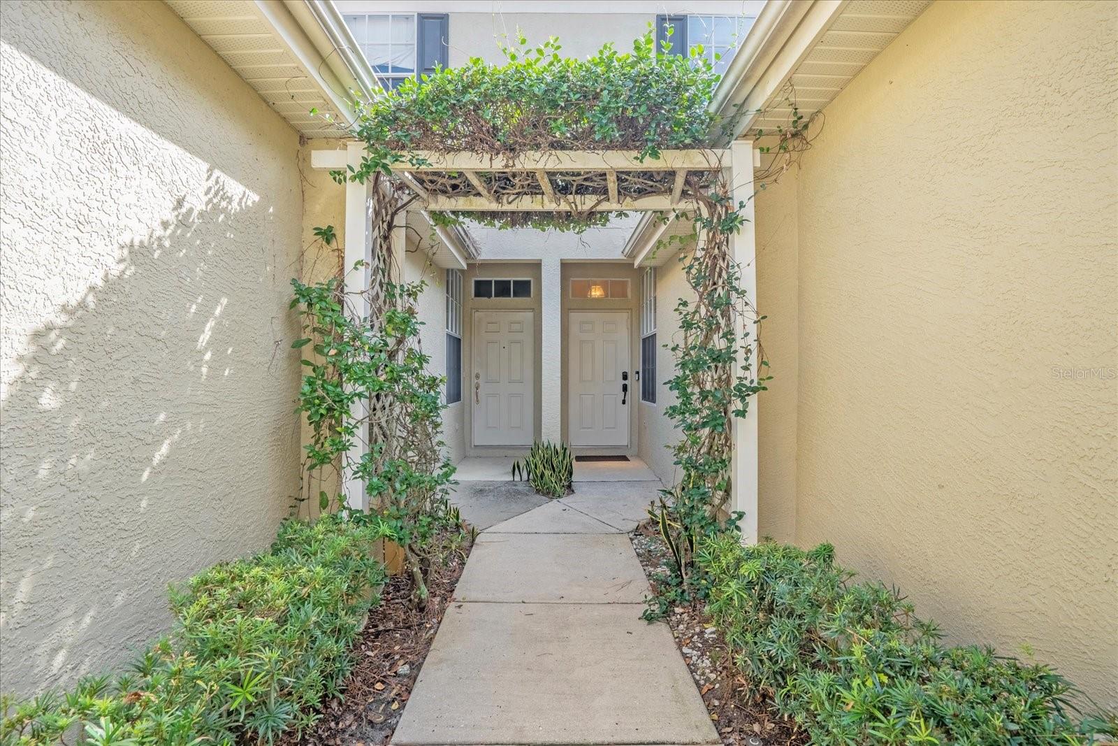 With a private driveway leading to the oversized 1 car garage, you walk under the gorgeous ivy covered trellis along the path to the front door. As you step inside, you'll be greeted by an inviting living space and an open floor plan, adorned with natural light and a cozy atmosphere. The kitchen boasts an eating area and ample storage, making meal preparation a delight.