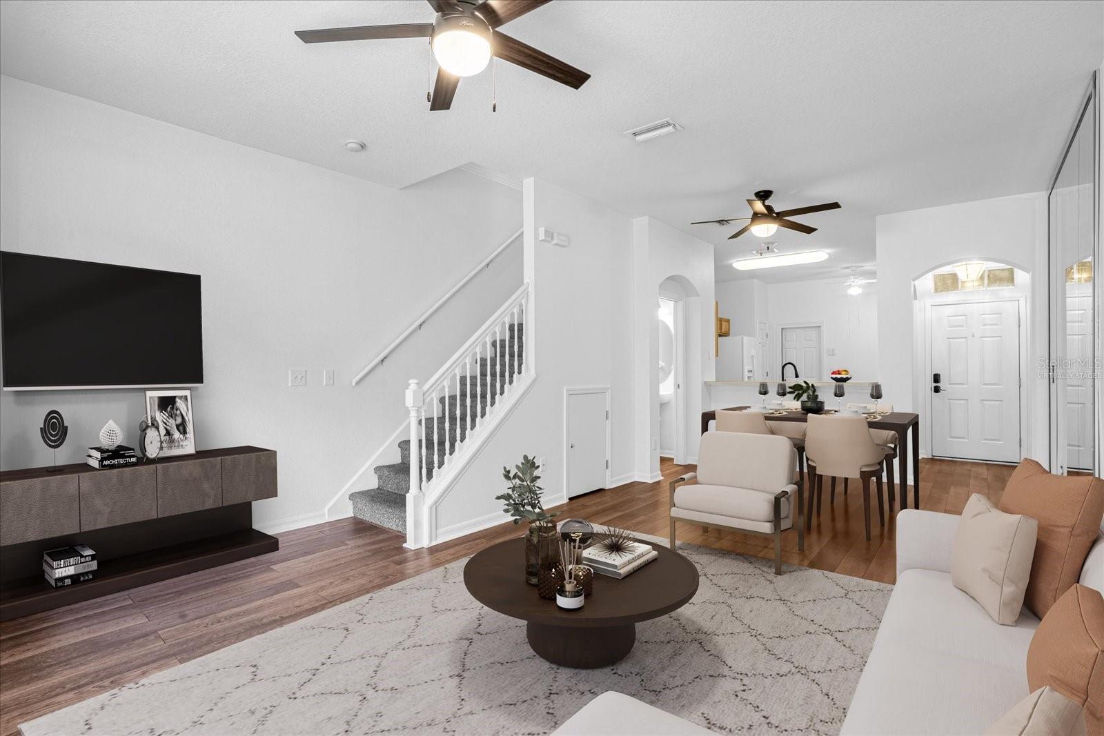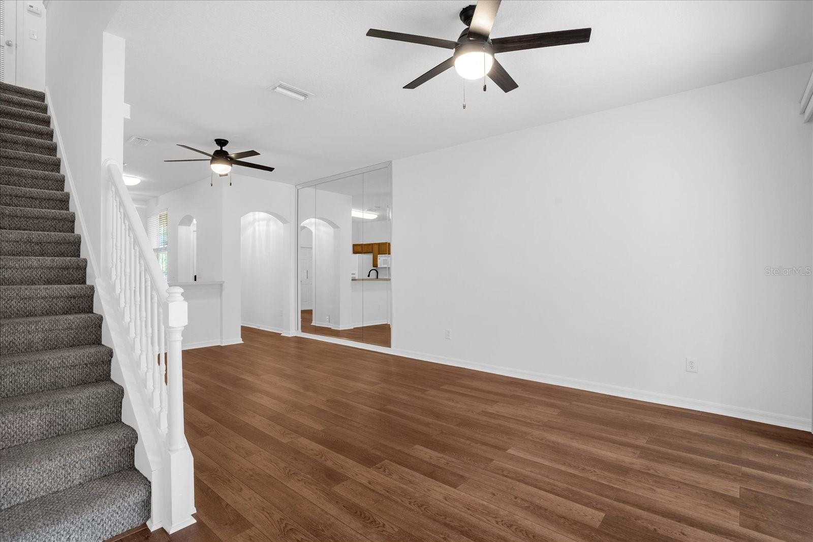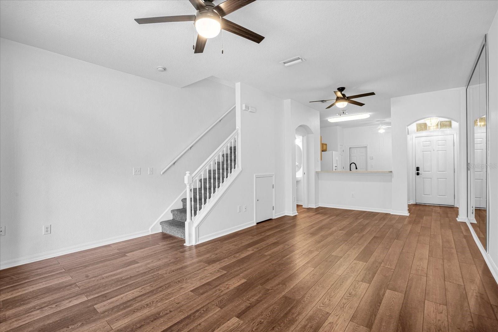 New vinyl flooring, fresh paint, and recently professionally cleaned, you will find this townhome move in ready. The open floor plan and 9+ ft ceilings make the living area feel bigger than it really is and allows for a wonderful flow from the eat in kitchen to dining space to living room/great room.