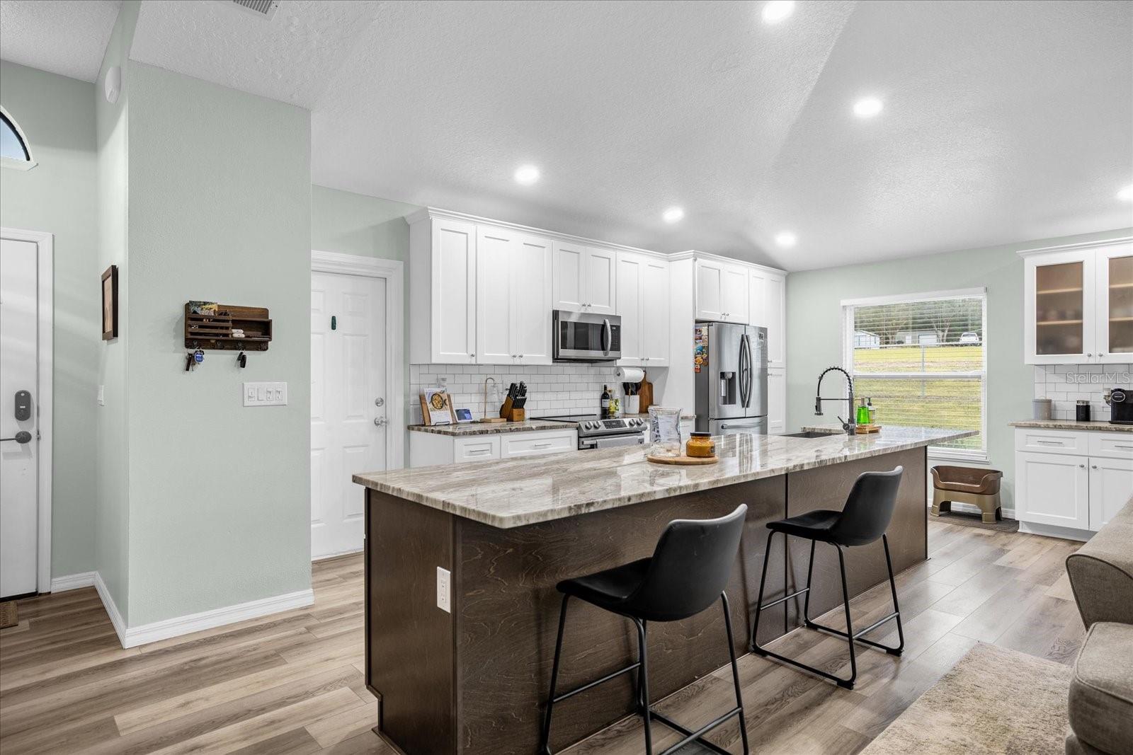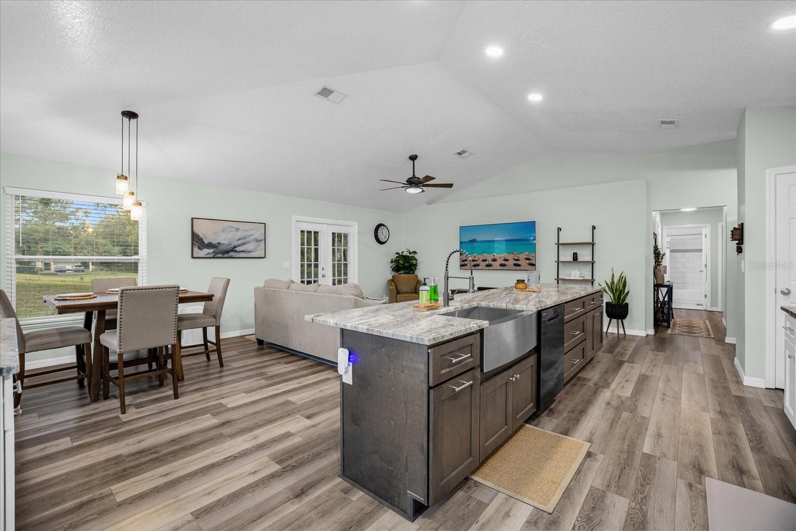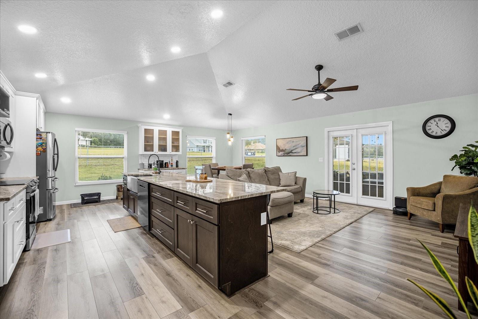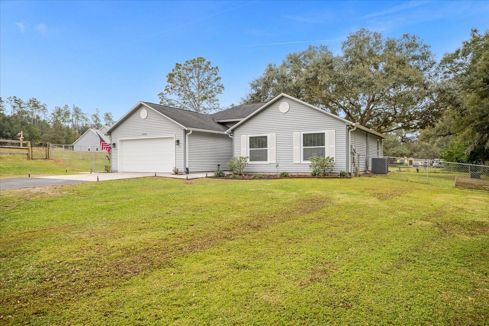 Welcome to your charming oasis! This beautifully updated 3 bedroom, 2 bath home is nestled on a spacious 1.12-acre lot (2 parcels), offering a perfect blend of comfort and tranquility. As soon as you walk in the door you will be WOWED by the vastness of the kitchen and great room area. So open and inviting with GORGEOUS granite countertops and a MASSIVE island. With the soaring ceilings, this main living area is where you will spend most of your time enjoying so much room but also somehow feeling cozy at the same time. The open-concept layout creates a warm and inviting atmosphere, with a modern kitchen featuring stainless steel appliances, granite countertops, and ample cabinet space. The living room boasts natural light, perfect for relaxing or entertaining guests.