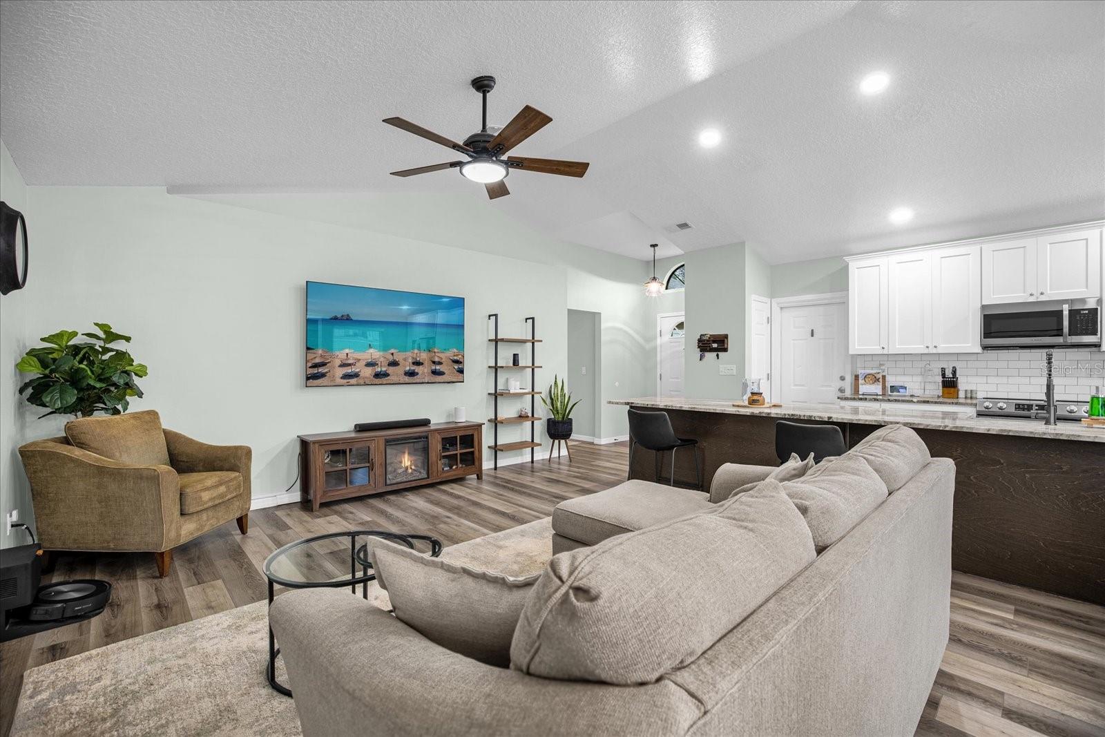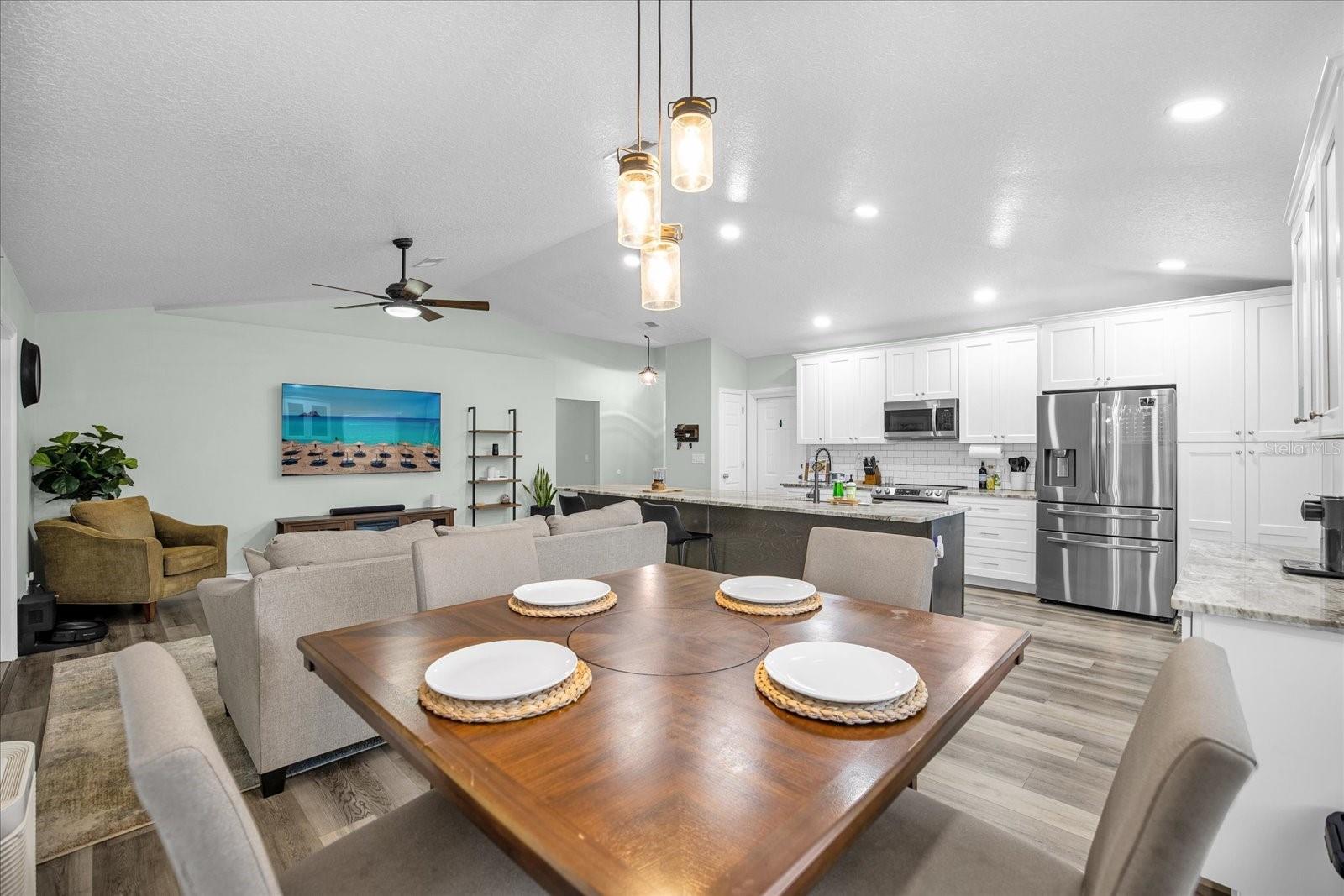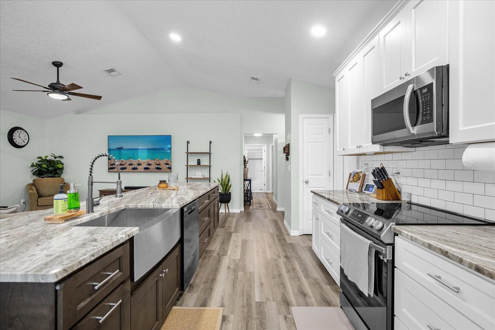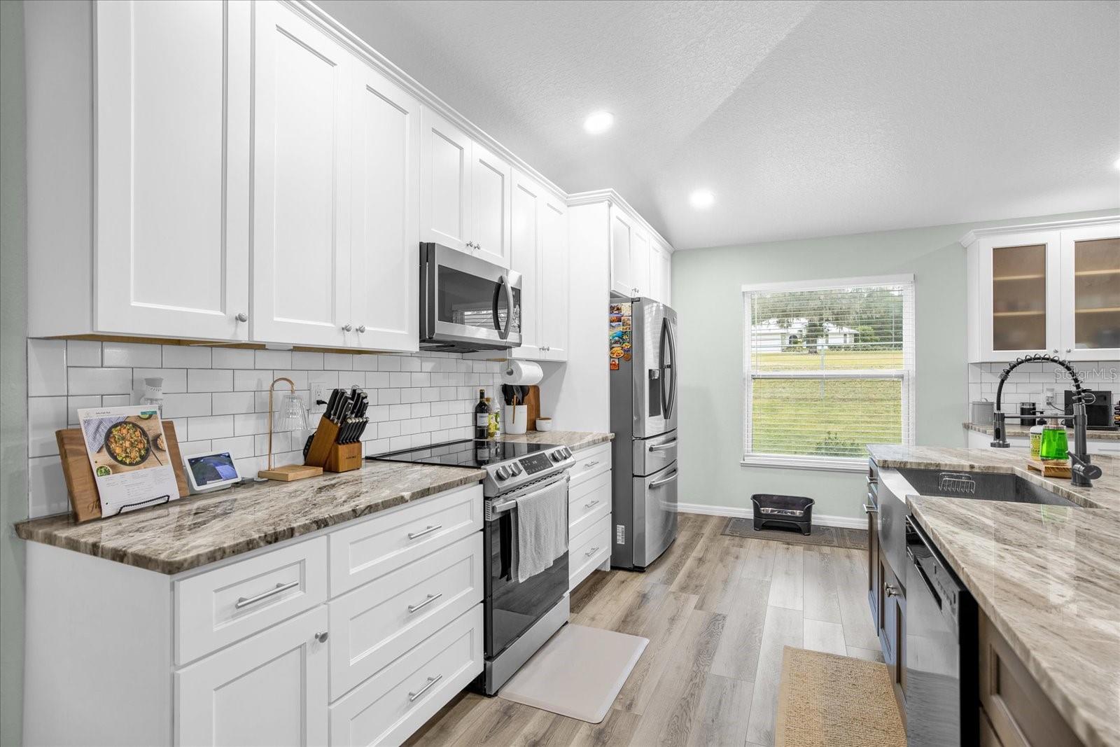 Welcome to your charming oasis! This beautifully updated 3 bedroom, 2 bath home is nestled on a spacious 1.12-acre lot (2 parcels), offering a perfect blend of comfort and tranquility. As soon as you walk in the door you will be WOWED by the vastness of the kitchen and great room area. So open and inviting with GORGEOUS granite countertops and a MASSIVE island. With the soaring ceilings, this main living area is where you will spend most of your time enjoying so much room but also somehow feeling cozy at the same time. The open-concept layout creates a warm and inviting atmosphere, with a modern kitchen featuring stainless steel appliances, granite countertops, and ample cabinet space. The living room boasts natural light, perfect for relaxing or entertaining guests.