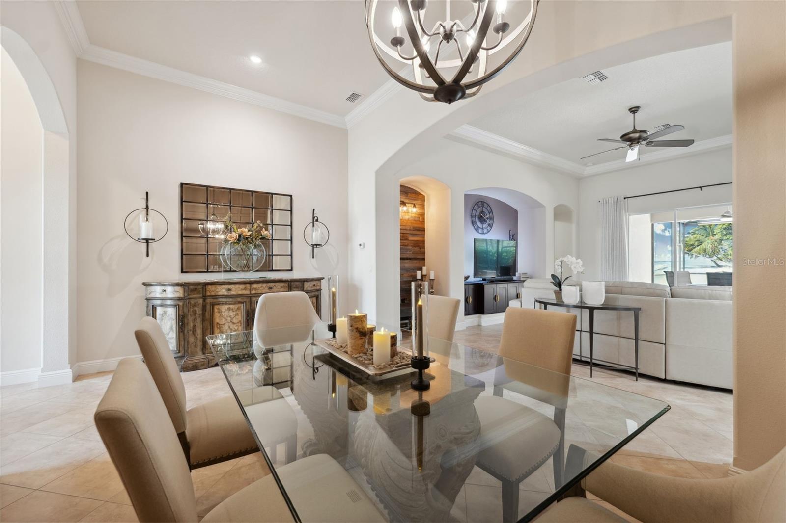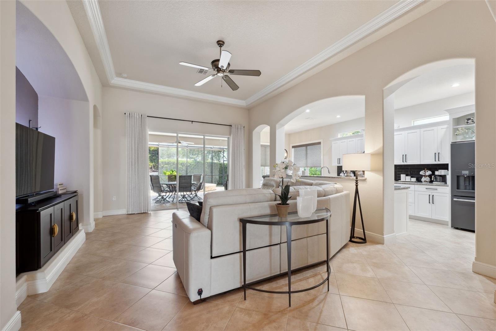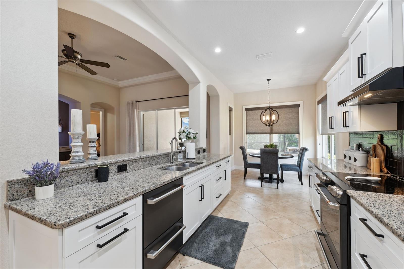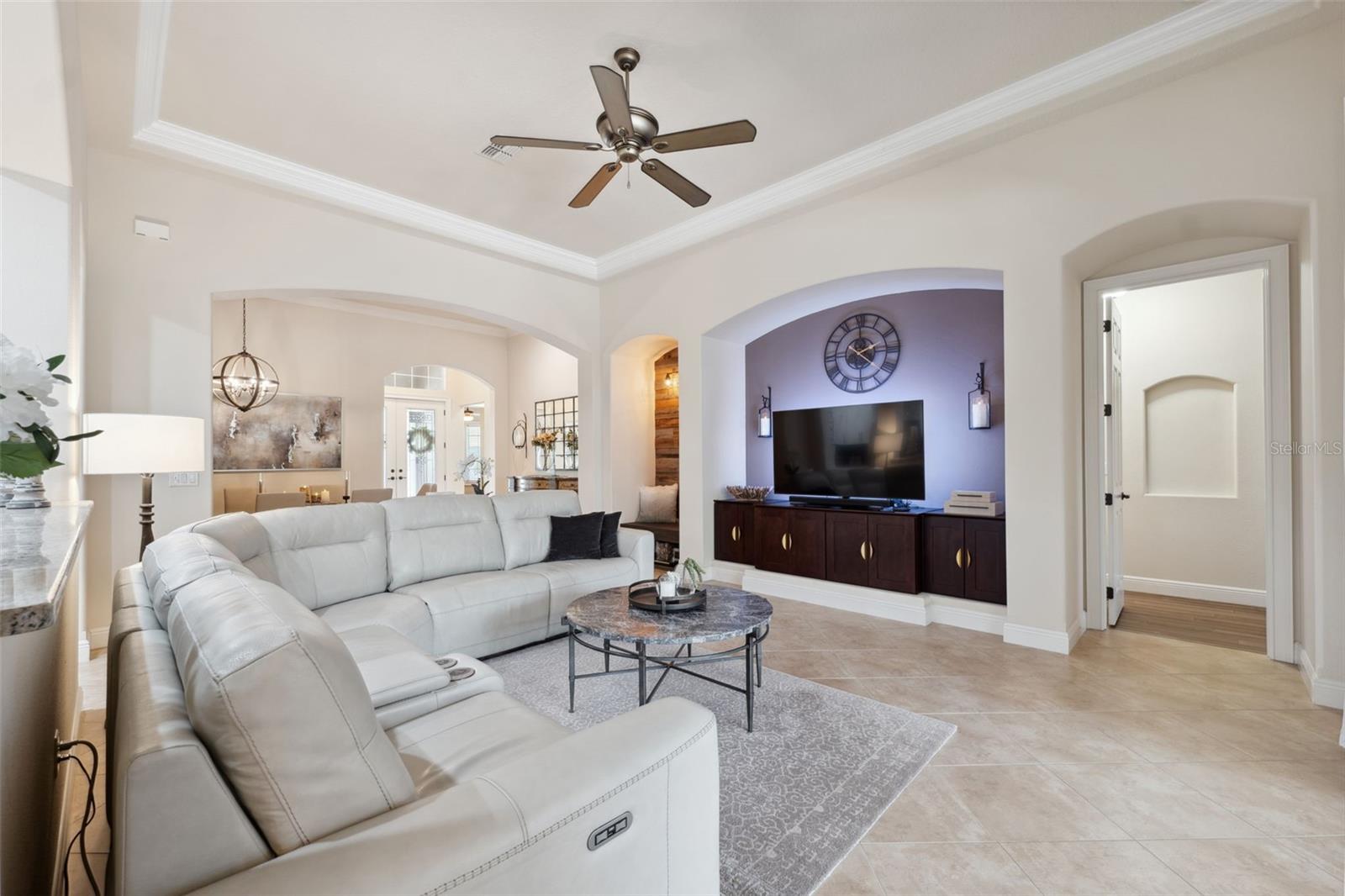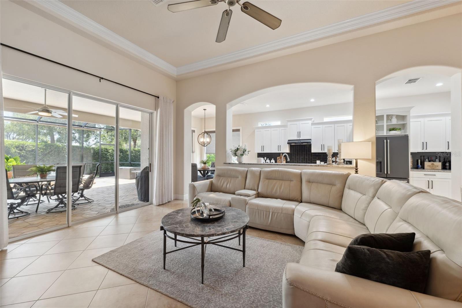 opened living area, featuring 12 ft ceilings with Crown Molding. Dining room has a beautiful Chandelier. Kitchen features GE "Cafe" Appliances, Refrigerator, Range, Dishwasher, Exhaust Fan. Great Room includes a custom built in TV Cabinet. Lanai has been re-screened, built in heated spa has been refaced with travertine pavers, driveway was extended 16 inches on both sides. Custom window treatments, power shades, & led lights. Golf club with restaurant and social facilities. The list goes on and on! THIS IS A MUST SEE!