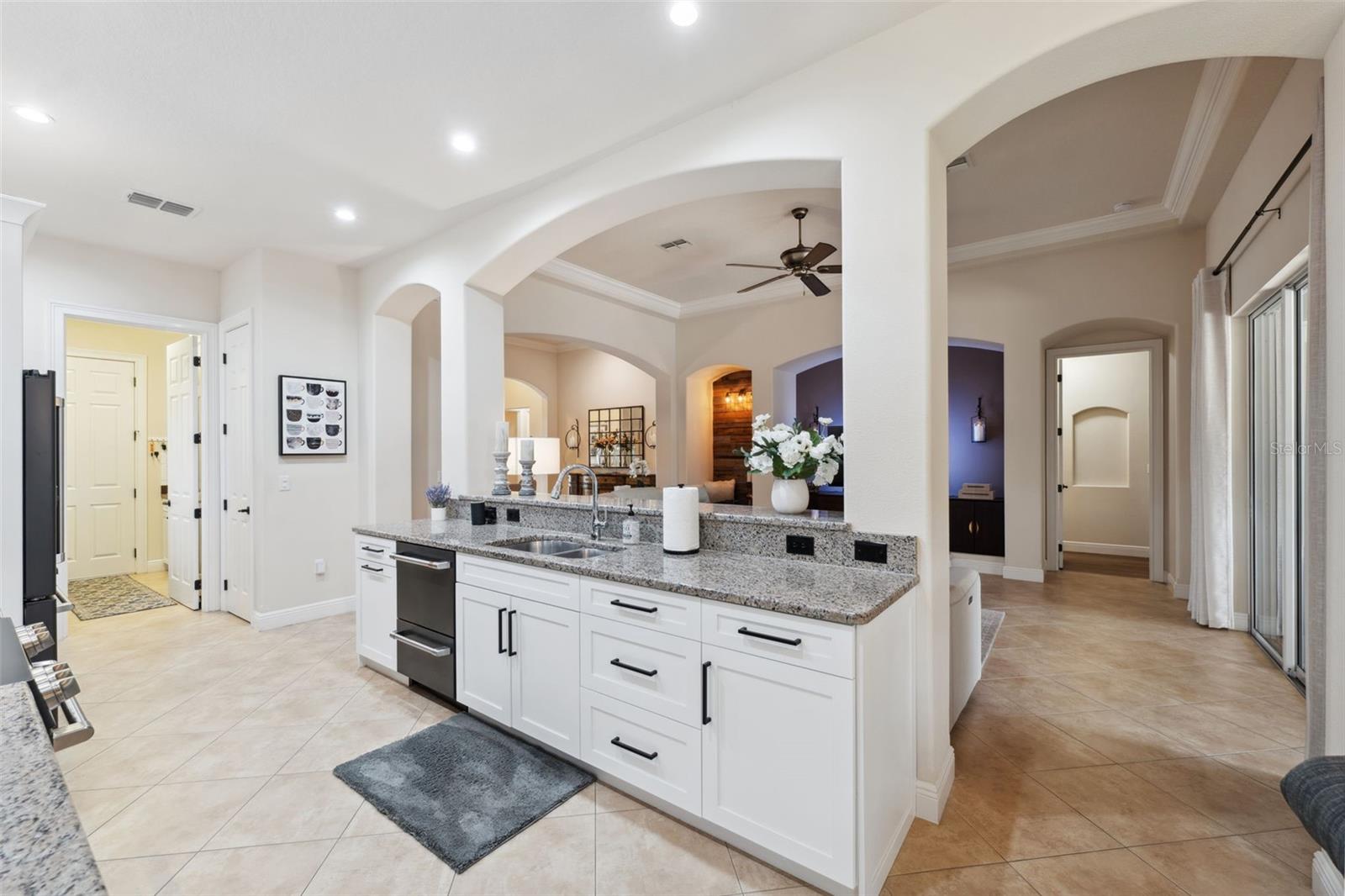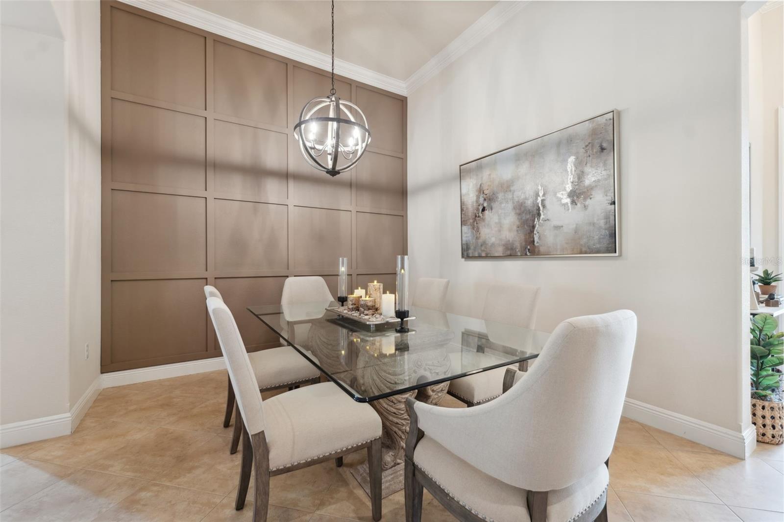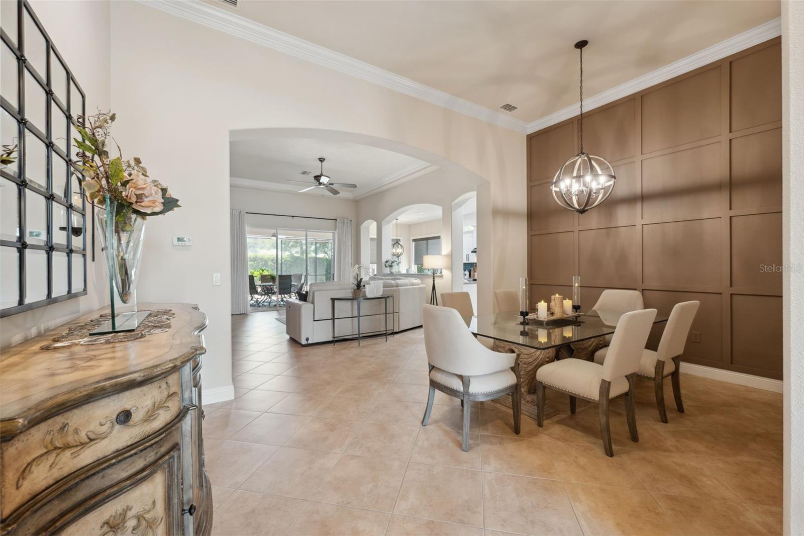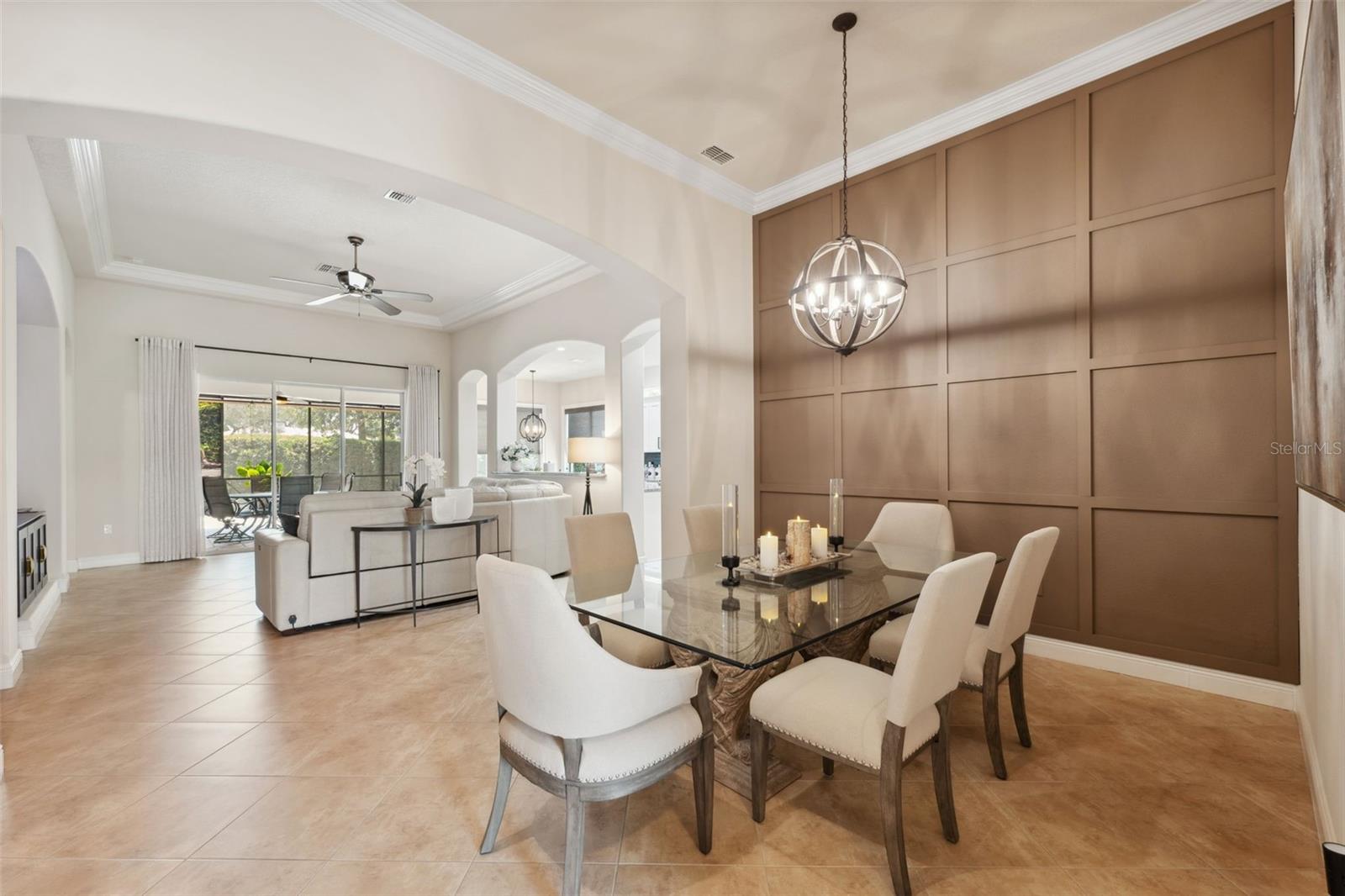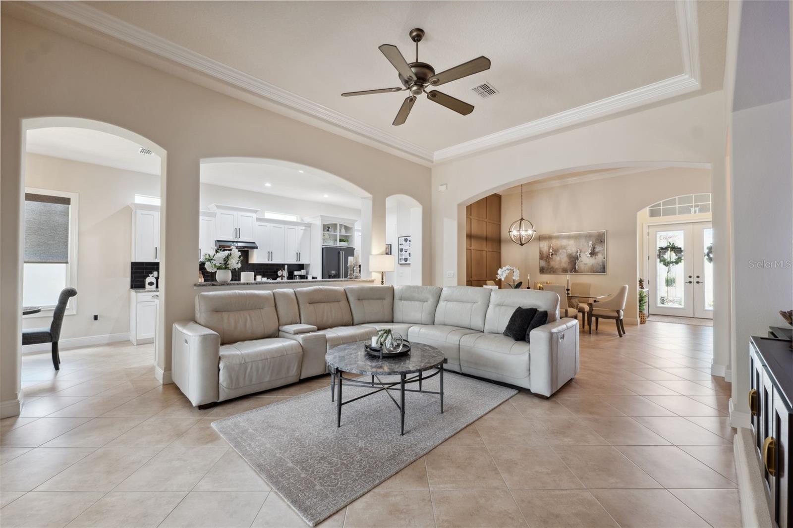 opened living area, featuring 12 ft ceilings with Crown Molding. Dining room has a beautiful Chandelier. Kitchen features GE "Cafe" Appliances, Refrigerator, Range, Dishwasher, Exhaust Fan. Great Room includes a custom built in TV Cabinet. Lanai has been re-screened, built in heated spa has been refaced with travertine pavers, driveway was extended 16 inches on both sides. Custom window treatments, power shades, & led lights. Golf club with restaurant and social facilities. The list goes on and on! THIS IS A MUST SEE!