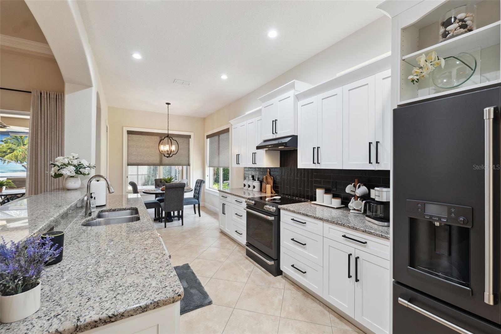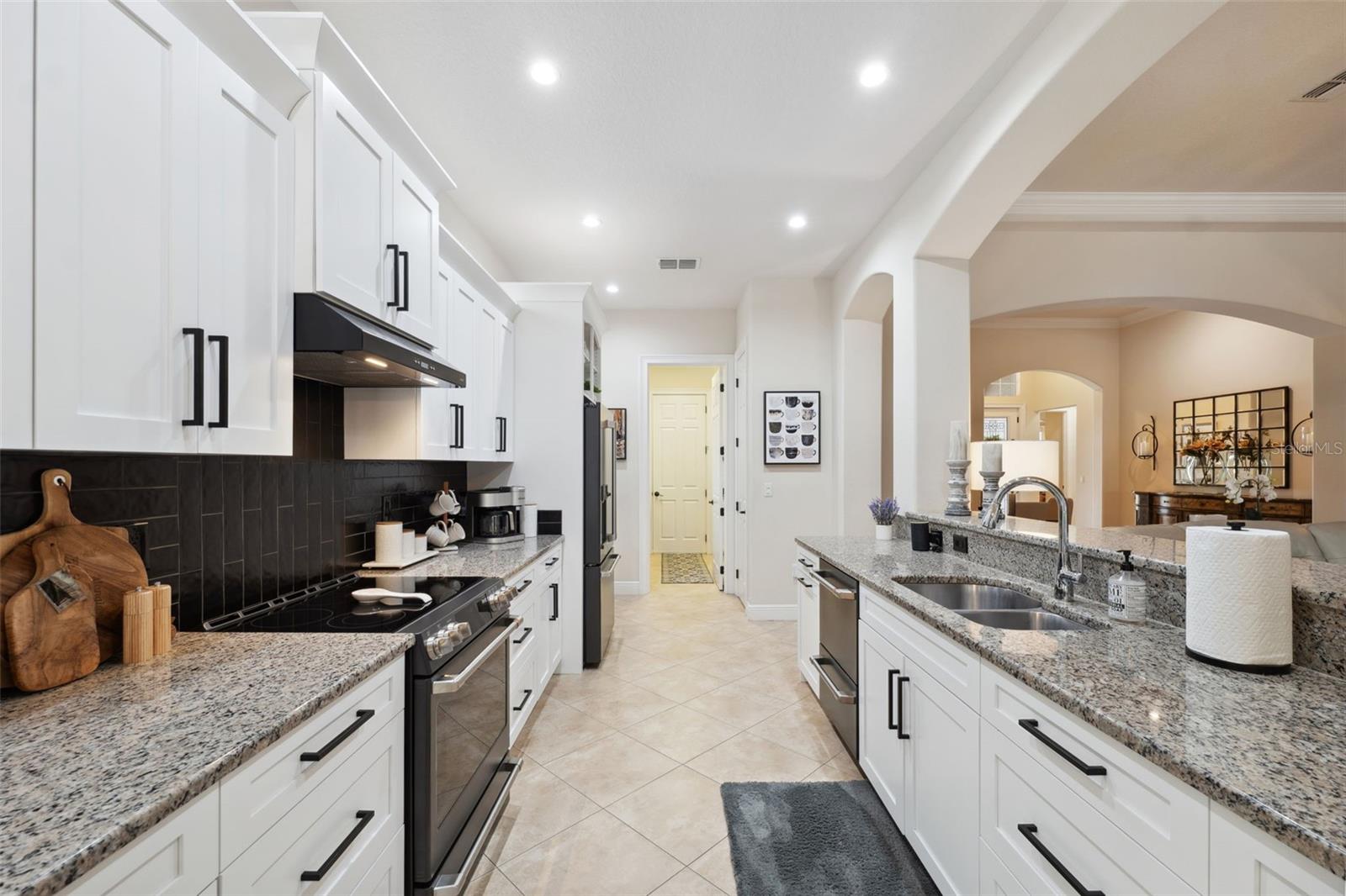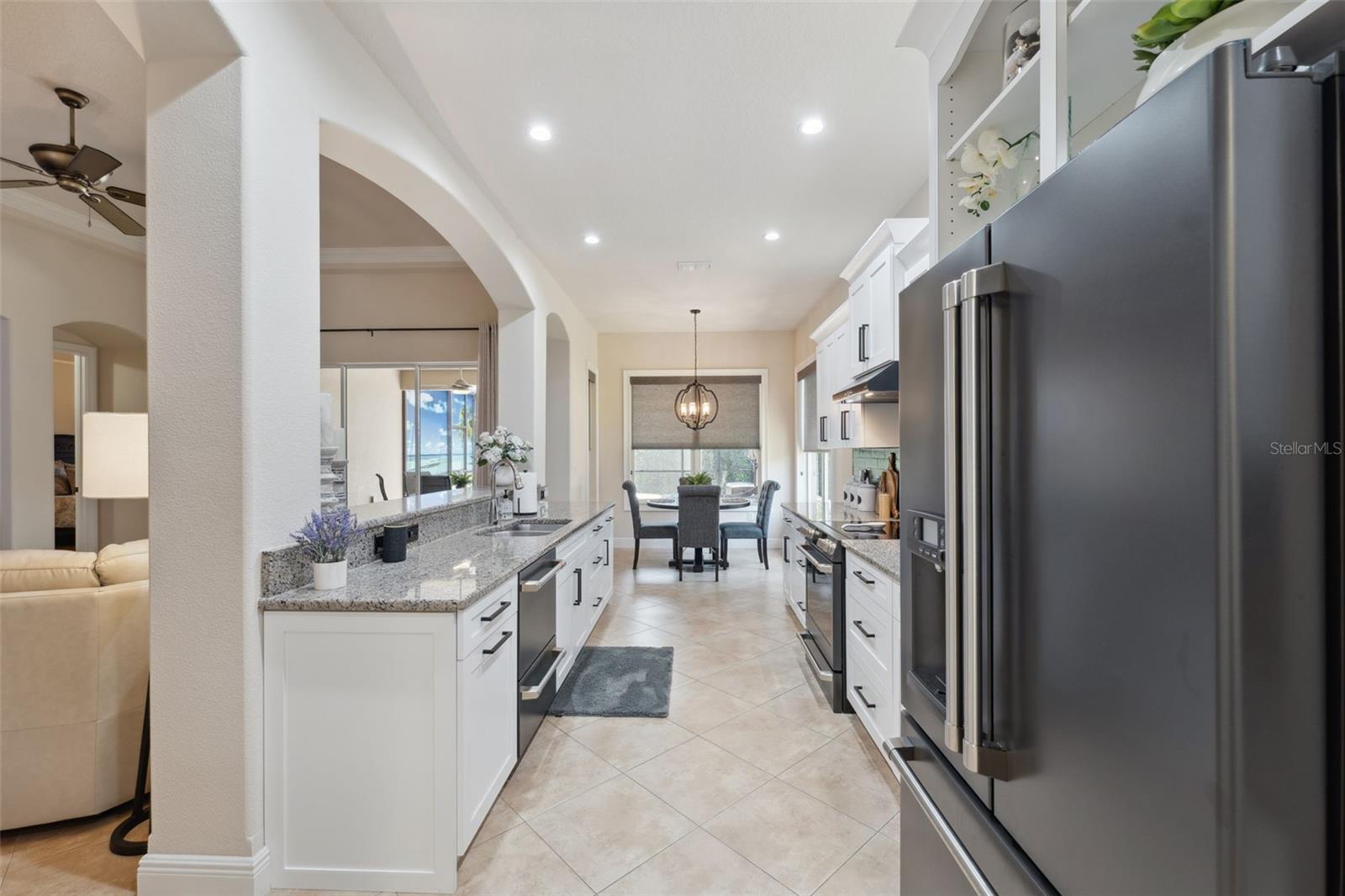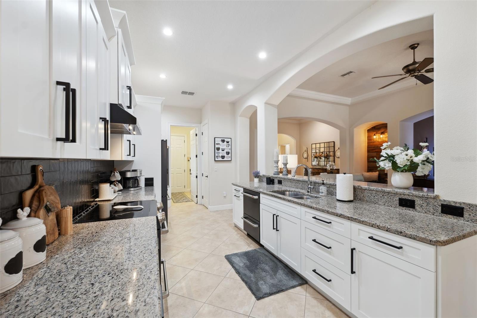 opened living area, featuring 12 ft ceilings with Crown Molding. Dining room has a beautiful Chandelier. Kitchen features GE "Cafe" Appliances, Refrigerator, Range, Dishwasher, Exhaust Fan. Great Room includes a custom built in TV Cabinet. Lanai has been re-screened, built in heated spa has been refaced with travertine pavers, driveway was extended 16 inches on both sides. Custom window treatments, power shades, & led lights. Golf club with restaurant and social facilities. The list goes on and on! THIS IS A MUST SEE!